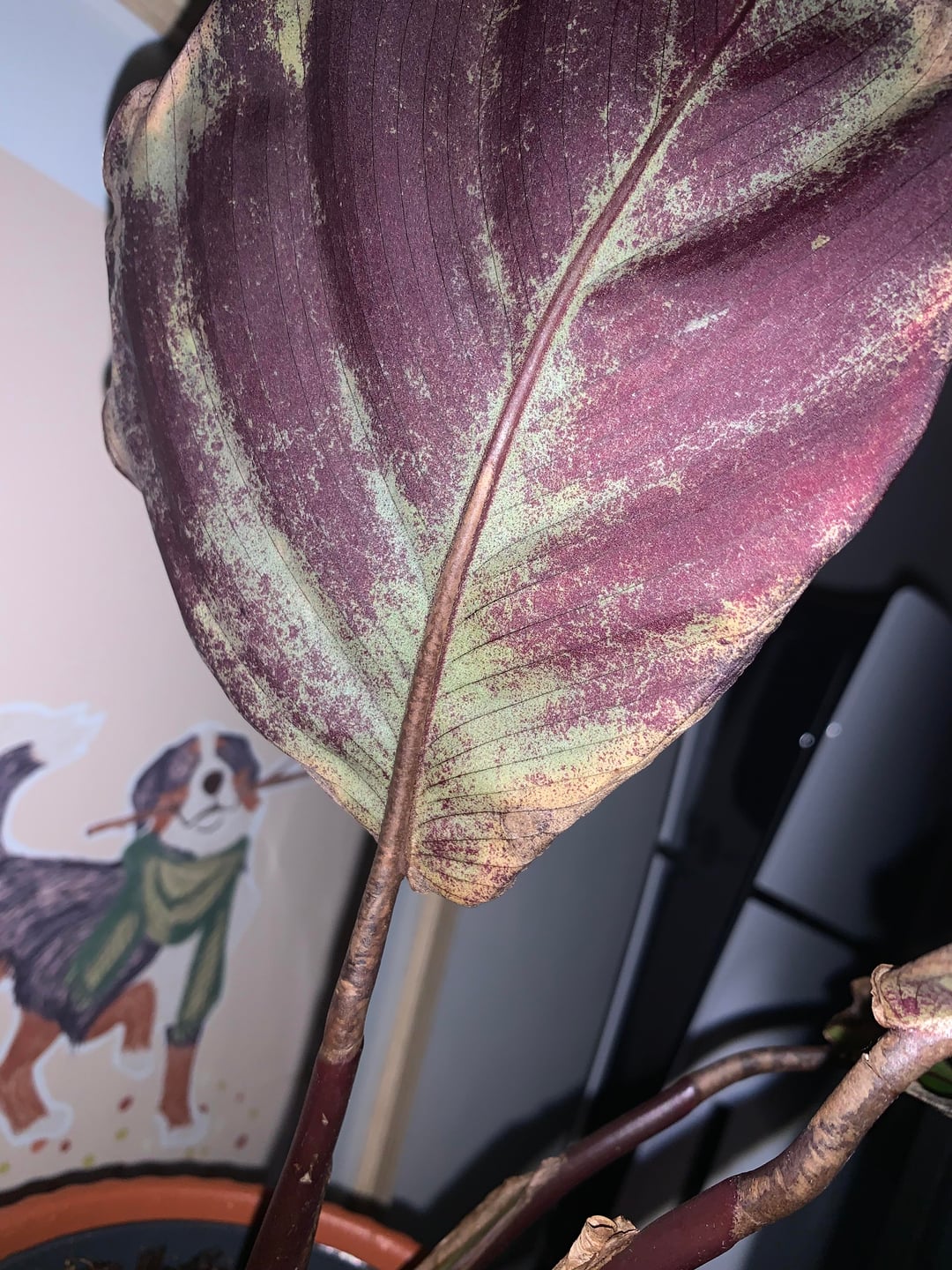 I bought this calathea about six months ago. At first, it was adapting really well and even started putting out new leaves. But once summer began, things went downhill. The weather was hot and dry — which it clearly didn’t like — and then it got thrips. I managed to deal with them, but they made a comeback later. Now the plant looks strange underneath the leaves, and whenever I touch or smear those spots, they leave behind a purple-tinted trail. I’m afraid it might be fungal?