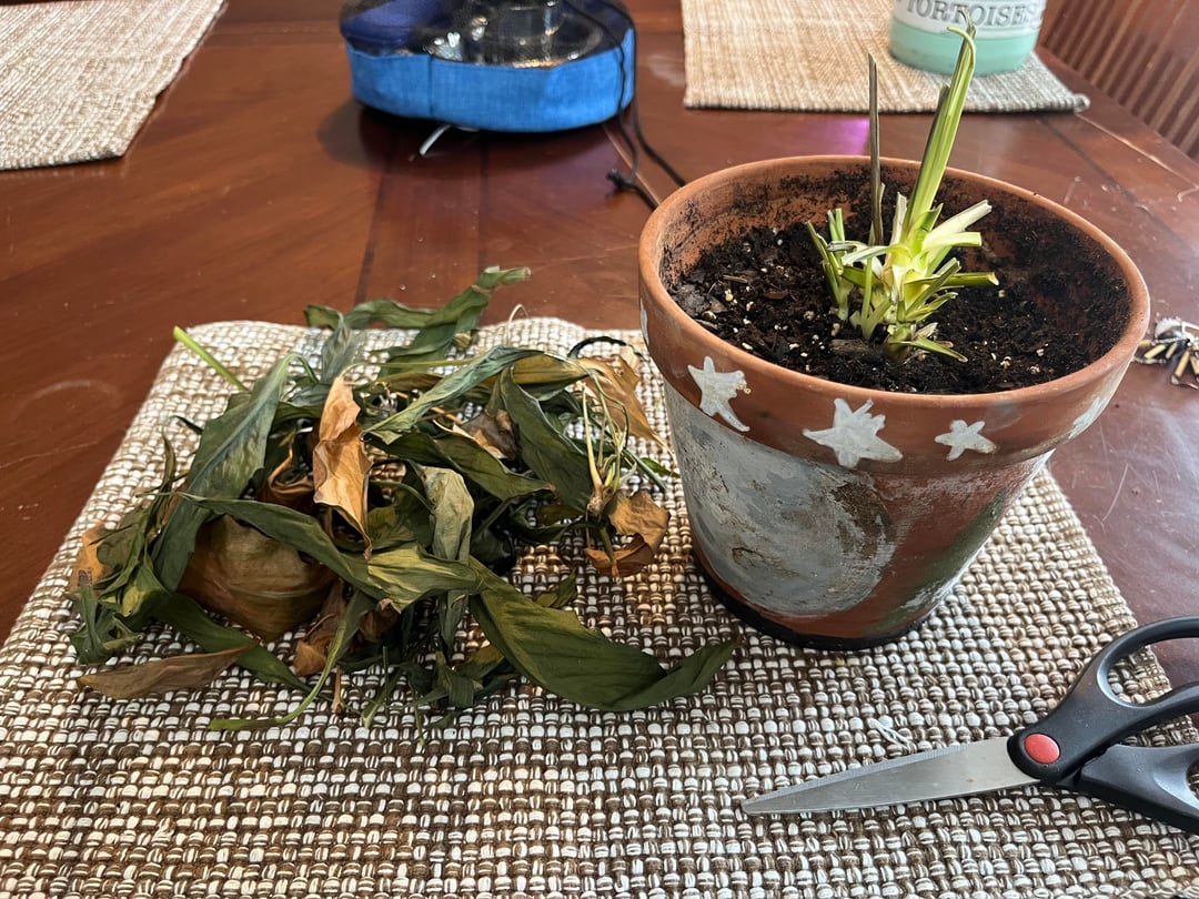 I’ve had a rough spell recently and only just now have gotten around to watering my plants again. I think there’s still some green left on this Peace lily but I can’t tell since I’m colorblind.