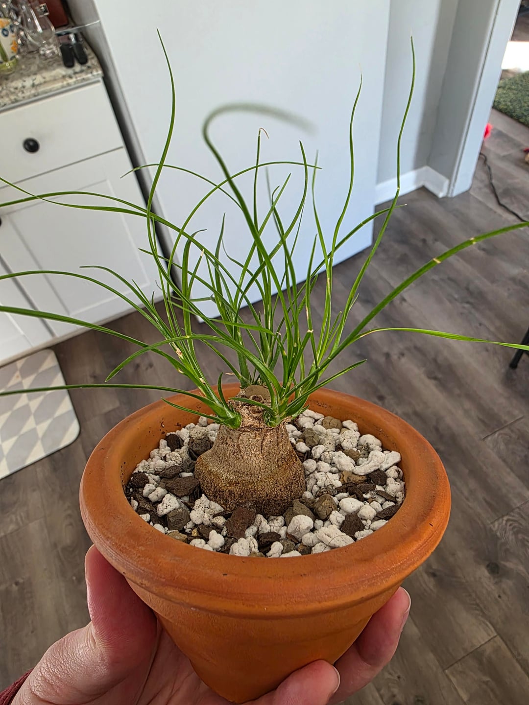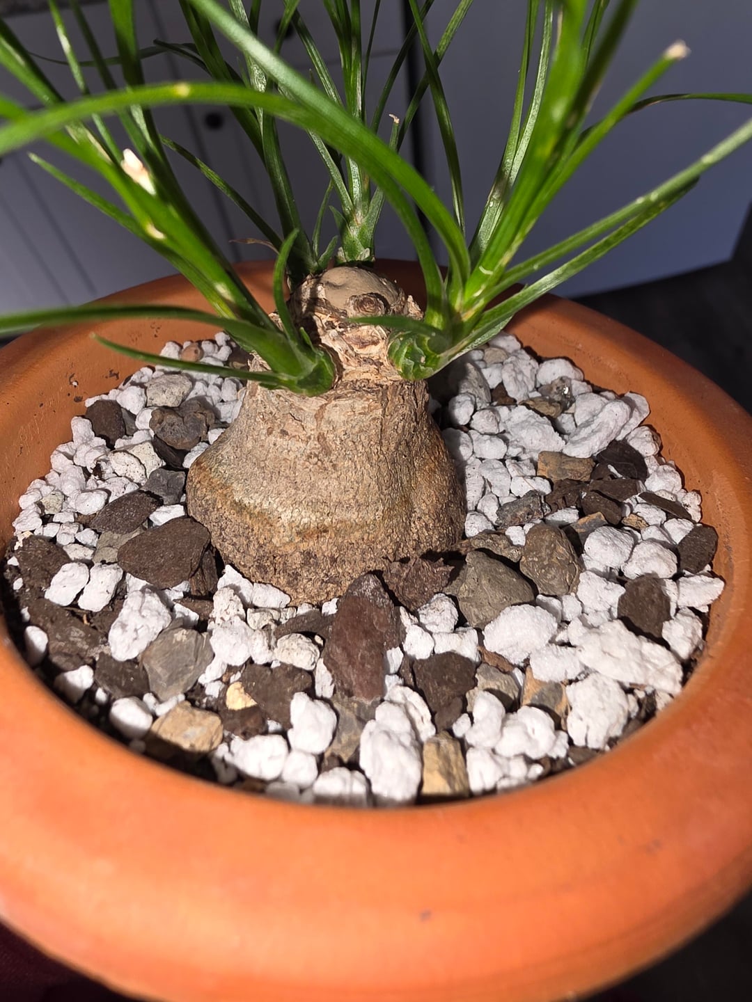 I have been worried about overwatering so I hardly water but it seems to be shriveling up a bit and and isn't solid like my large ponytail palm…like when I squeeze the little one there is a bit of give but not like it's rotting. The leaves also have browning and are breaking at those brown points so I know I need to do SOMETHING different 😅