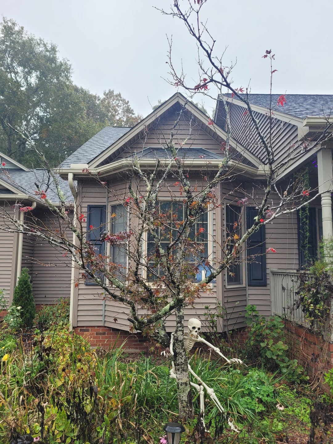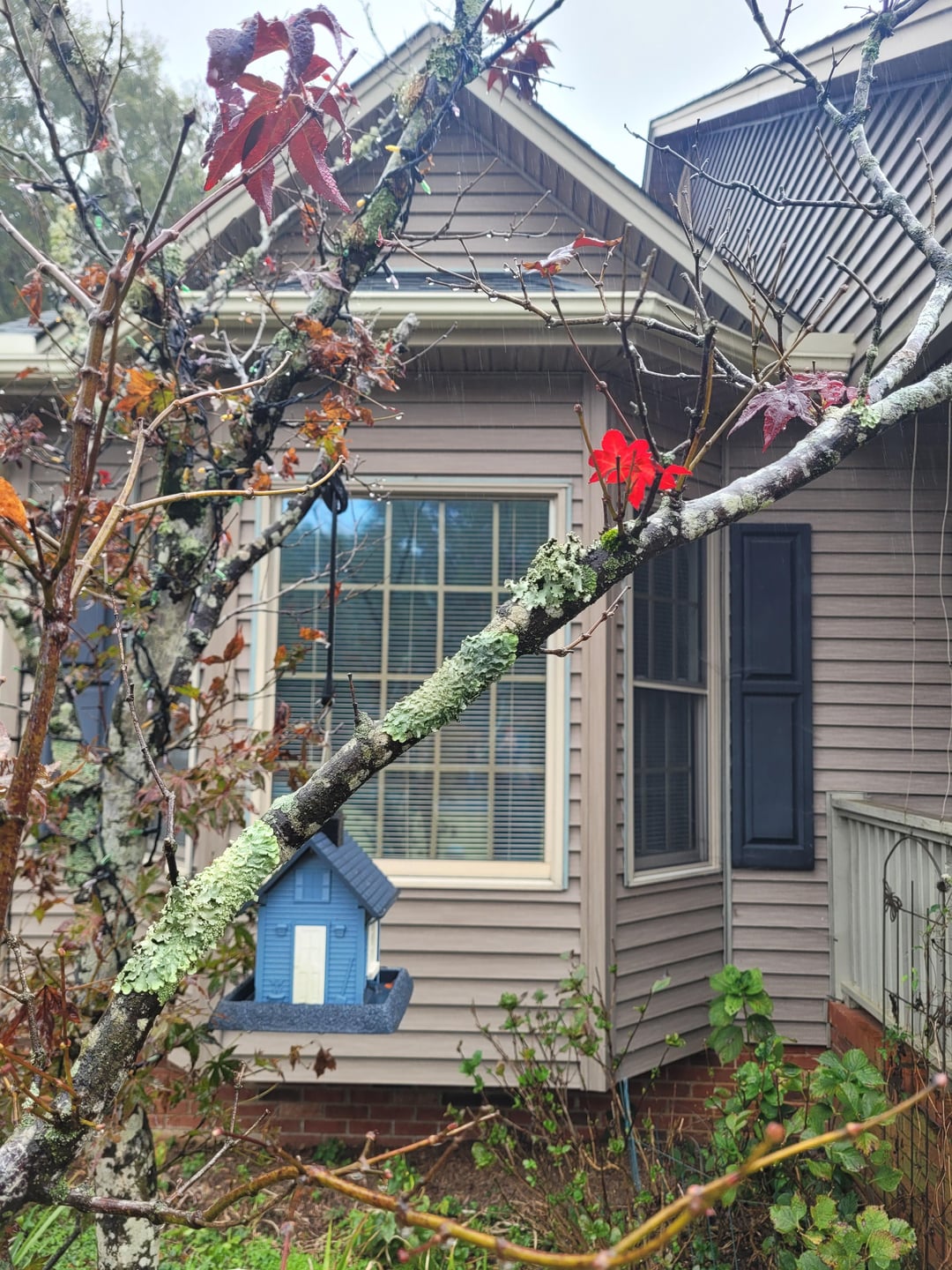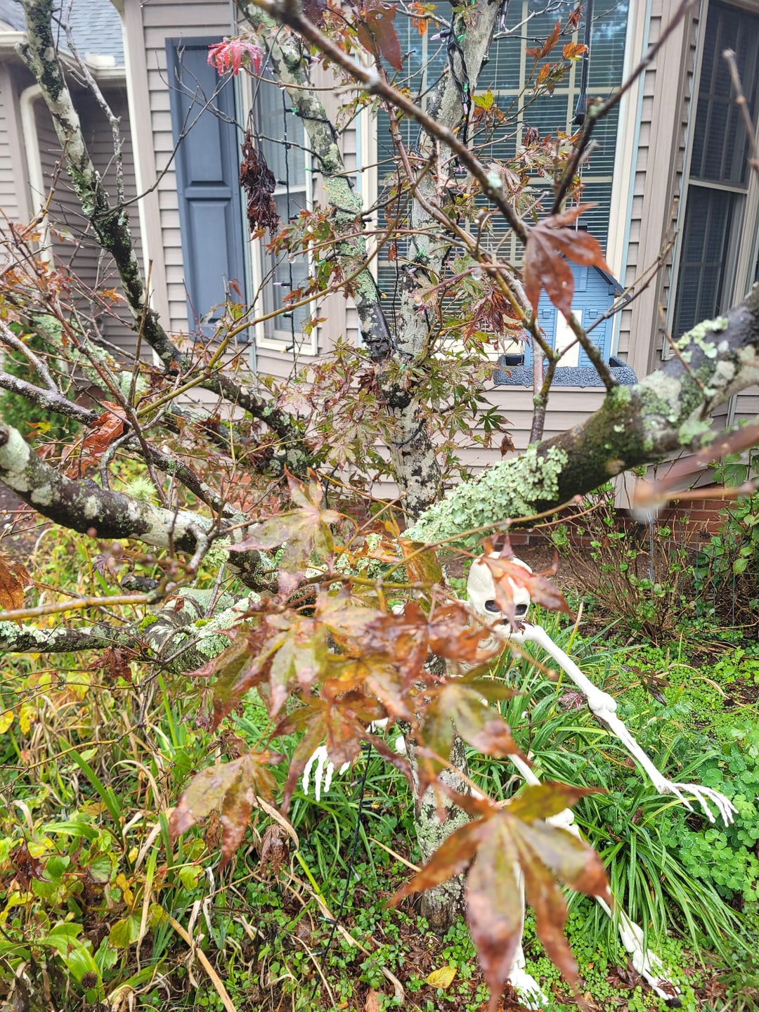 30ish+ year old Japanese maple, possibly Bloodgood cultivar – red leaves in spring and autumn, dark green red late summer. Full afternoon sun, zone 7b/8a southeast USA. It has been in decline for the last 5 or more years since I moved here. It never put out many leaves in spring – this is not bare because of fall. It did start putting out a few new leaves in late summer, which are the brighter red leaves, and many of the extended branch tips I thought were dead showed some minor activity at that time. But as you can see, there are also many larger branches that have died and broke off. I never provided irrigation or fertilizer to it which may have been the problem, which I'm not sure is reconcileable now.