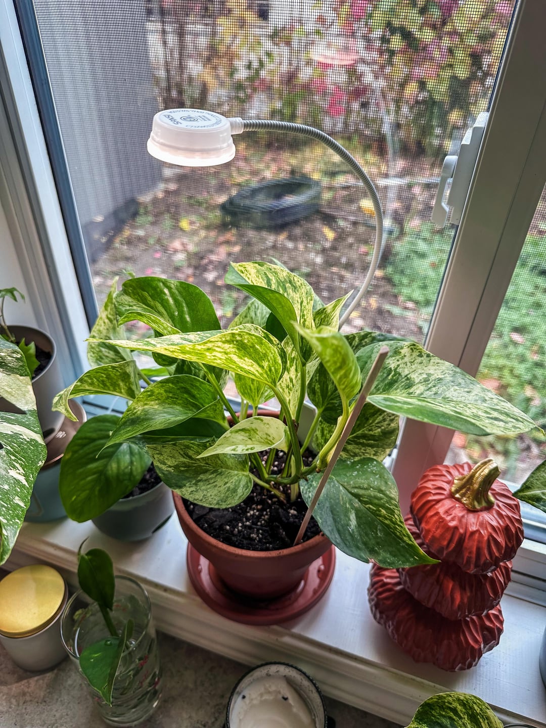It’s been one month today since I brought home this little Marble Queen, and she’s become my favourite pothos I own (collection has been growing crazy fast lmao). I repotted her recently and gave her leaves a wipe this morning and took a progress pic to compare to how she looked at the store (see last picture)! She always seems happy and has been growing very well 💞