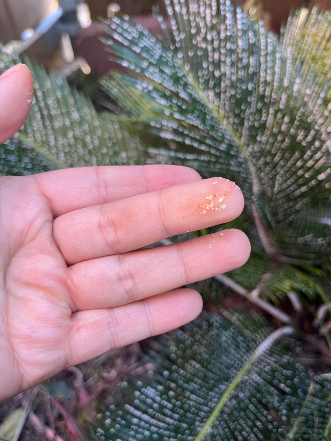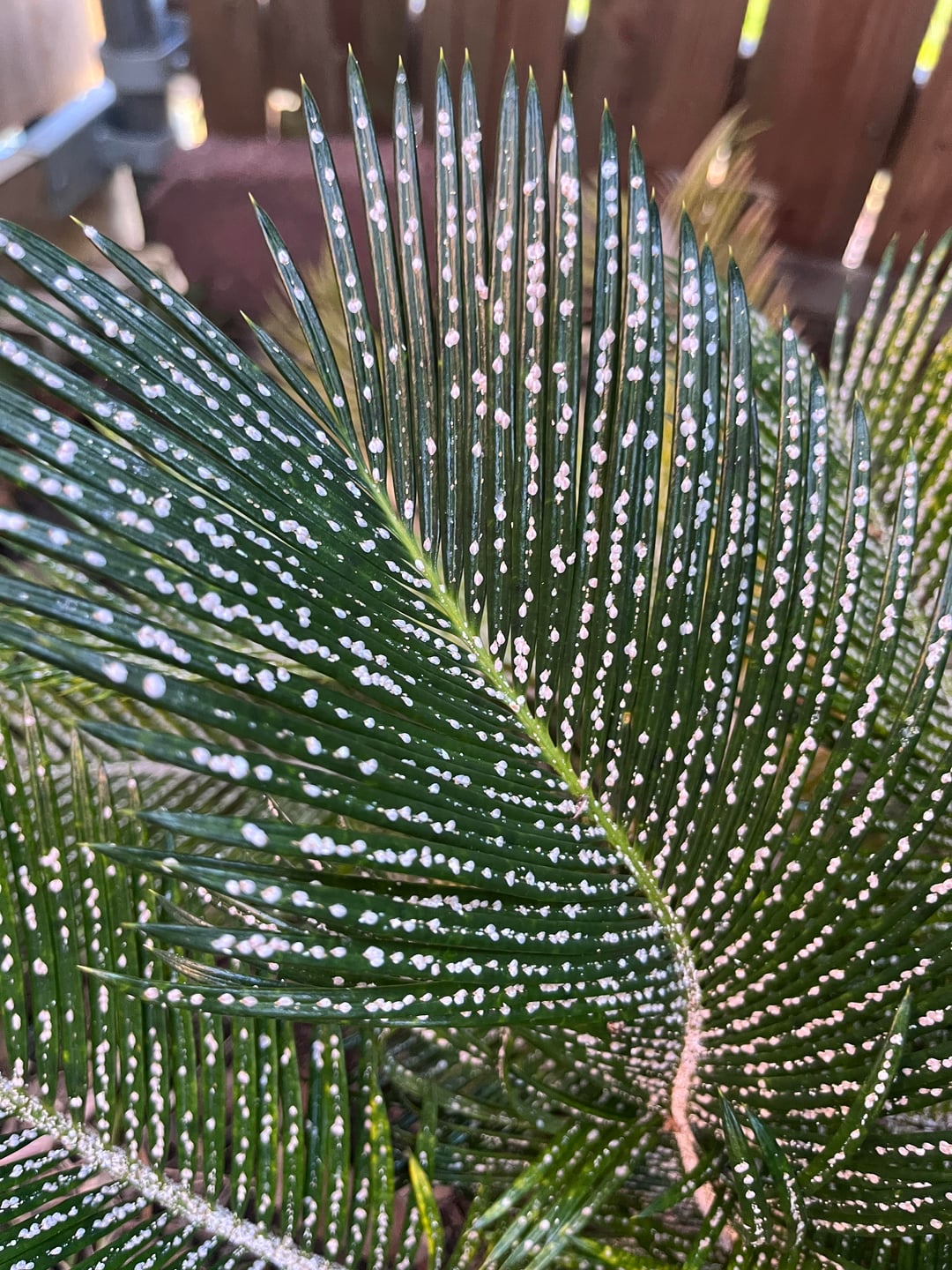 The white spots on the sago palm are most likely a pest known as cycad aulacaspis scale, also referred to as Asian cycad scale. This insect is a common and damaging pest for sago palms and other cycads. The insects appear as small, white, cottony-looking flecks that can densely cover the leaves, making the plant look as if it is covered in snow. The larger, roundish scales are females, while the smaller ones are males. These insects feed on the plant’s sap, which can cause significant damage and, if left untreated, can lead to the decline or death of the plant.