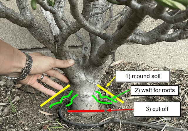 Would an air layer work? Leaving what’s in the ground and working from the ground up, literally. Once the air layer is done, no cutting chops, just raising the soil level to where the root flare is still visible?