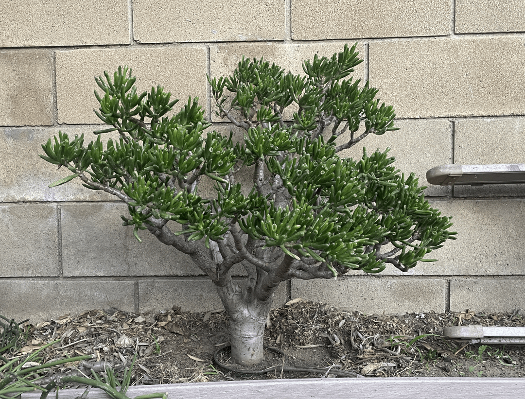 Jades don’t root flare well in general. It’s a common issue with them, even in many shown jades. At least given it’s in a training pot it’ll make digging it up easier. Crassula can be grown and trained with bonsai adjacent techniques. For instance you’ll only be able to clip and grow. For the most part even guy wires are only so useful. That being said they handle root pruining surprisingly well and will “back bud” pretty reliably when cut back. They even handle “defoliation”.