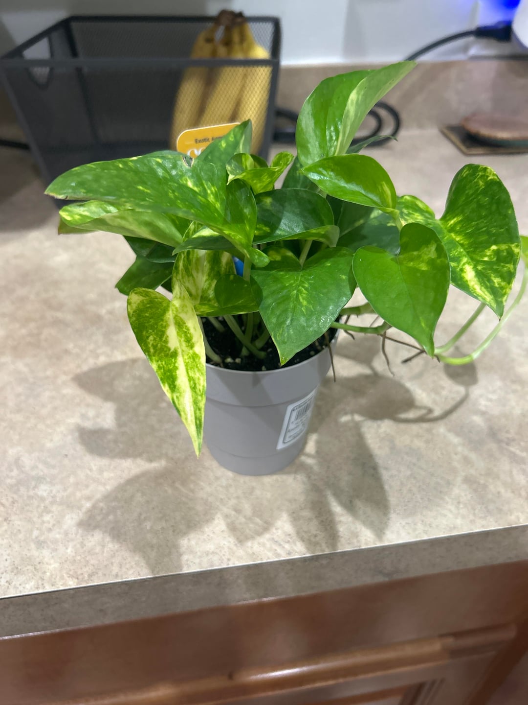 Exotic Angel is just the name of this line of plants from Costa Farms. The plant is a Golden Pothos. The more light it gets, the more variegation you will get. They’re pretty easy plants overall, just let the soil dry out a bit before watering.