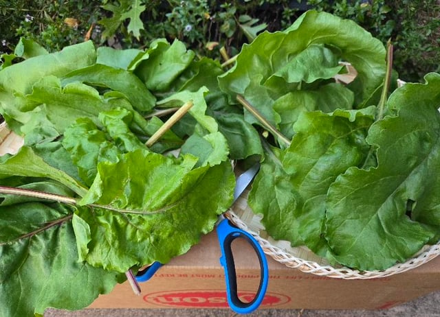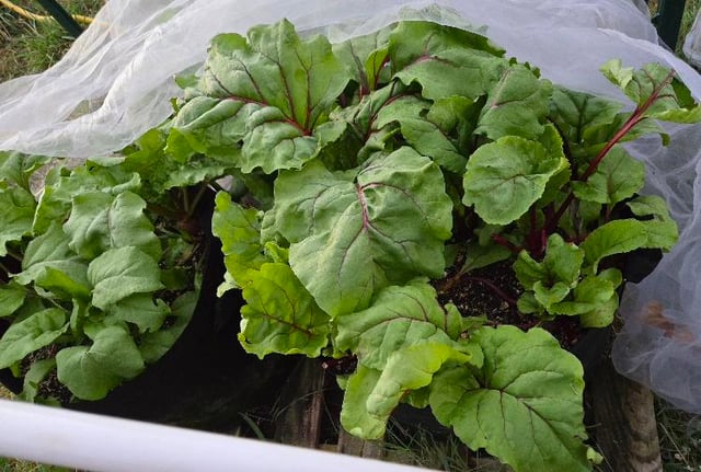 These are Early Wonder beets, planted 14 September. The tops are tall and lush, and I can see the shoulders of the roots developing well, beginning to push out of the earth. The roots are not yet full size, and I would like to leave them in place to develop longer, while still making a meal of these greens. Today is 30 October. NE Texas. Growing in 20-gallon grow bags.