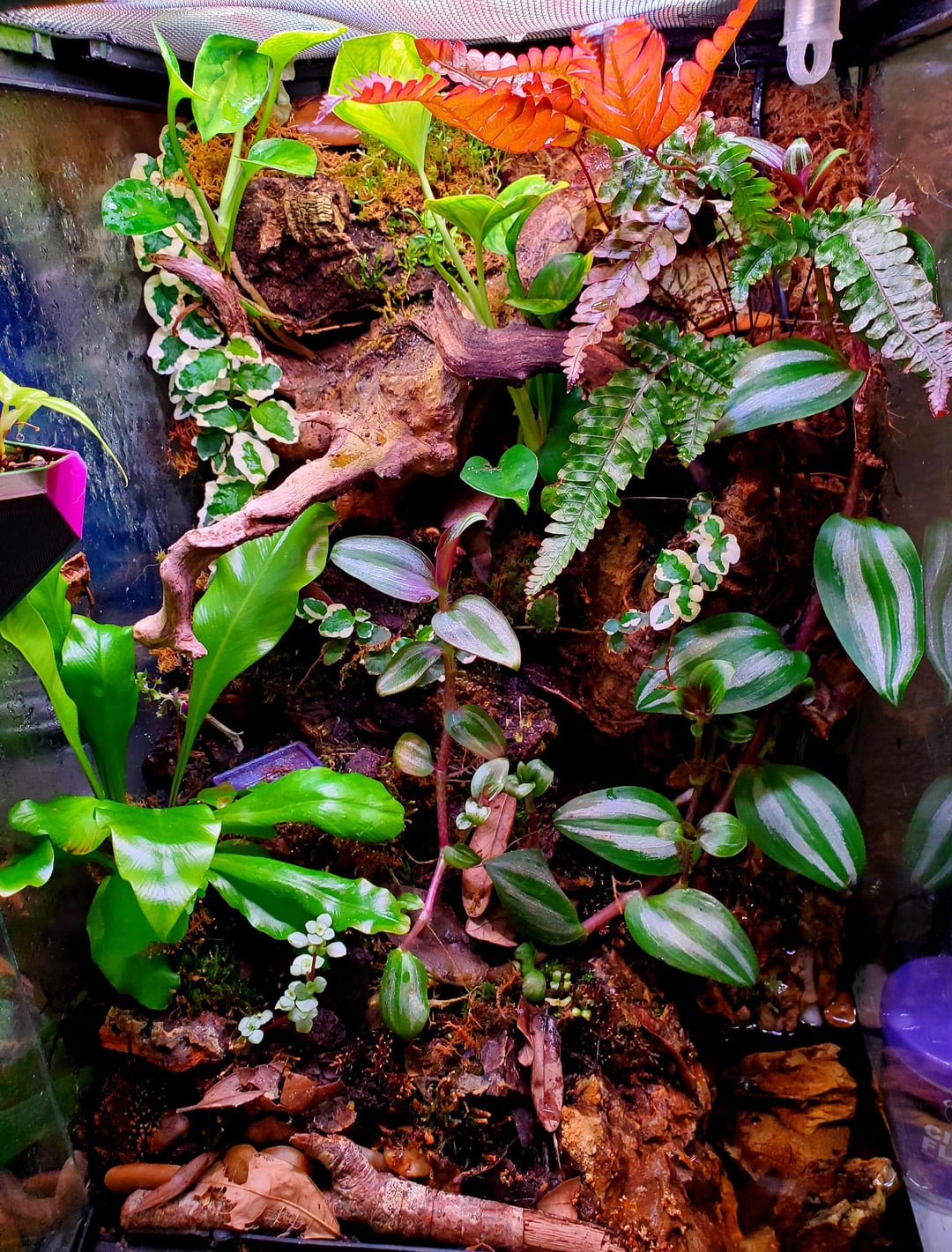 This vampire crab paludarium has been running for a couple of months now and it was doing fine, though not really thriving, especially the mosses. The lights I was using always felt a little underwhelming so I got something with a little more punch, and boy did it make a difference. The tricolor fern has gone super red, the tradescantia has shot off in all directions and the climbers are creeping around.
