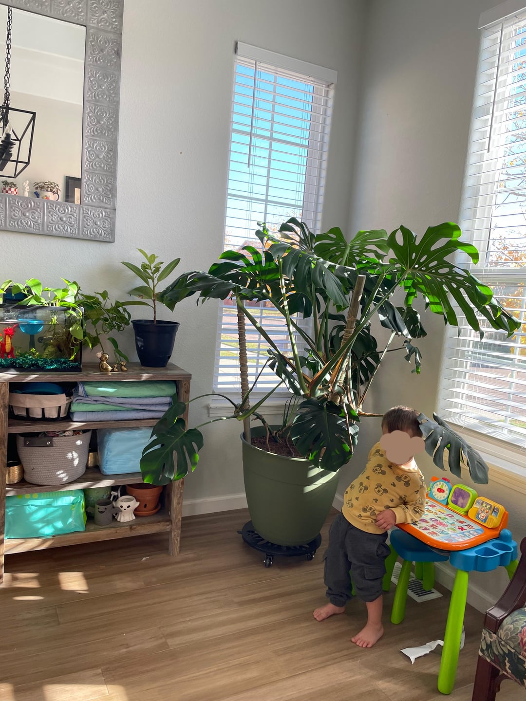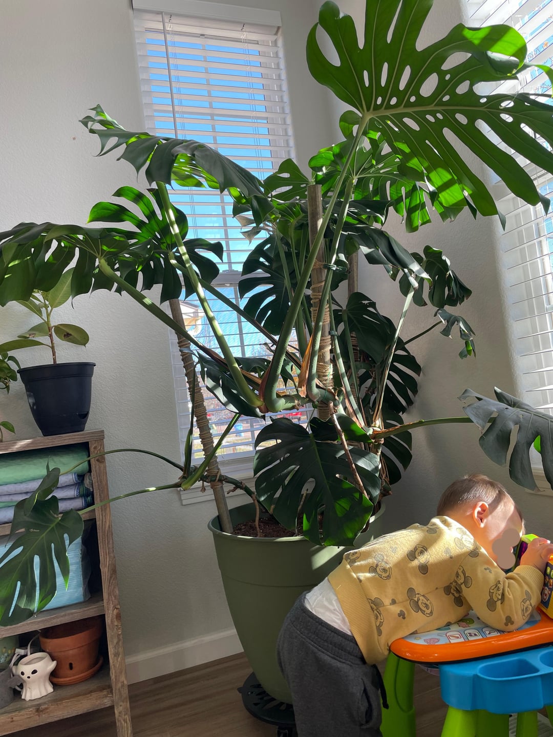 I have a 5 year old Monstera that has almost doubled in size in the last year. Inside the pot I can see 3 separate plants. I’m honestly scared to repot it at this point, does anyone think I even need to? Angry 2 year old for scale, sorry he ate the banana.