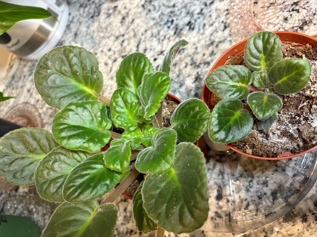 Edit, looking at it more closely, the pot may be OK when the leaves finish growing in. Generally you shouldn’t be able to see the soil when a violet is grown enough to start blooming. The all the leaves come out of the center (crown) going in a circle. As the leaves get older, they get bigger and have longer stems. The oldest leaves are hanging well over the side of the pot (which is good). Then there is a space and then a bunch of newer leaves in the center.
