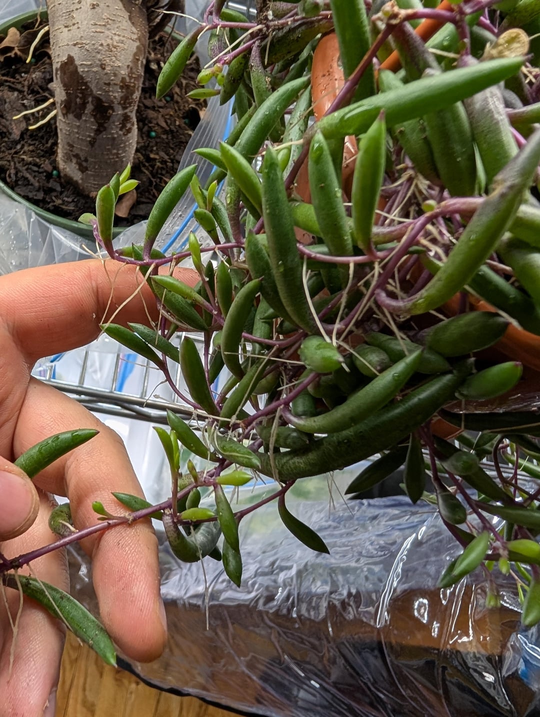 It’s growing. They’re quite easy to propagate by cutting and leaving them on top of the soil, theyd grow roots. And im assuming in your case, there is high humidity which will grow roots. You can cut each segment with a leaf and root and lay it on top of potting mix or soil and moisten a lil bit if you want a new plant.