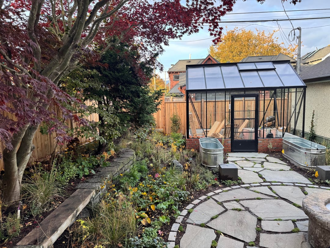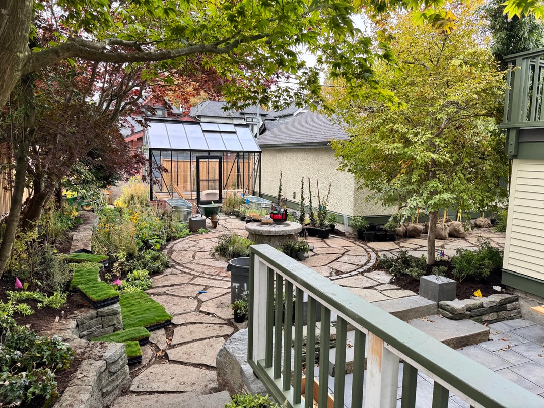 Over the summer we fully gutted the original yard which was just grass with a lot of concrete, and added a BC greenhouse, fire pit and installed stone pavers throughout.