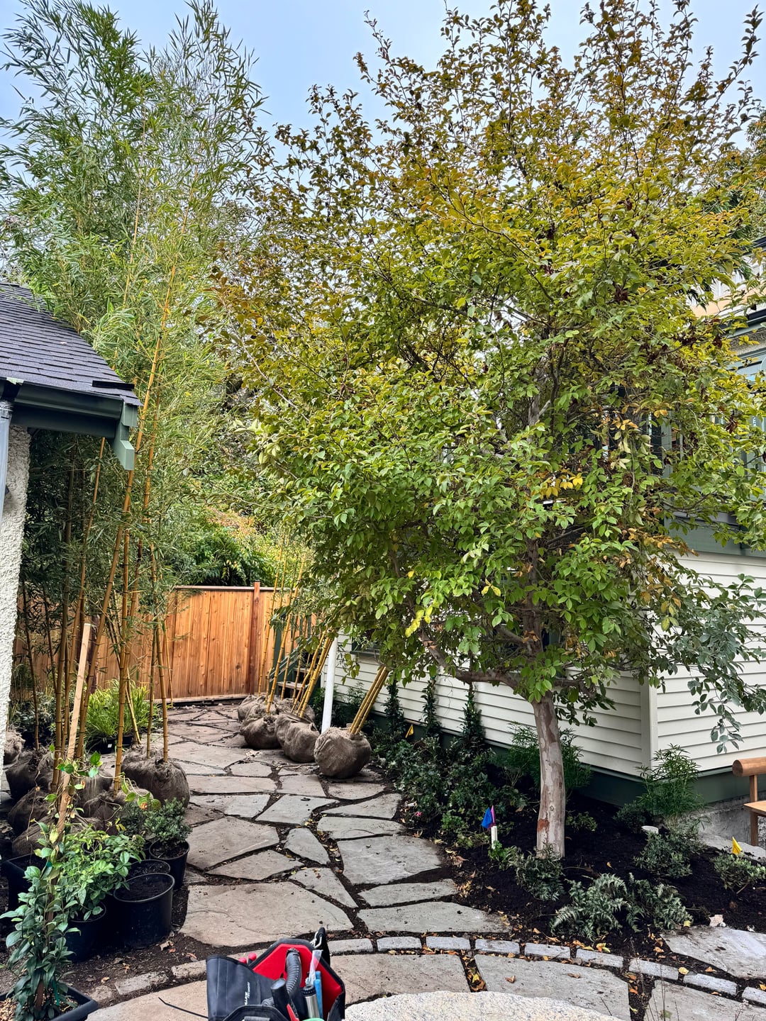 The Japanese maples were original to the house, but we’ve added some beautiful trees like Paperbark Maple, Serviceberry and Chinese dogwood (front yard), for height and seasonal drama. For shrubs, there are some Aztec Pearl Mexican Orange, little lime hydrangeas and some Daphne odora.