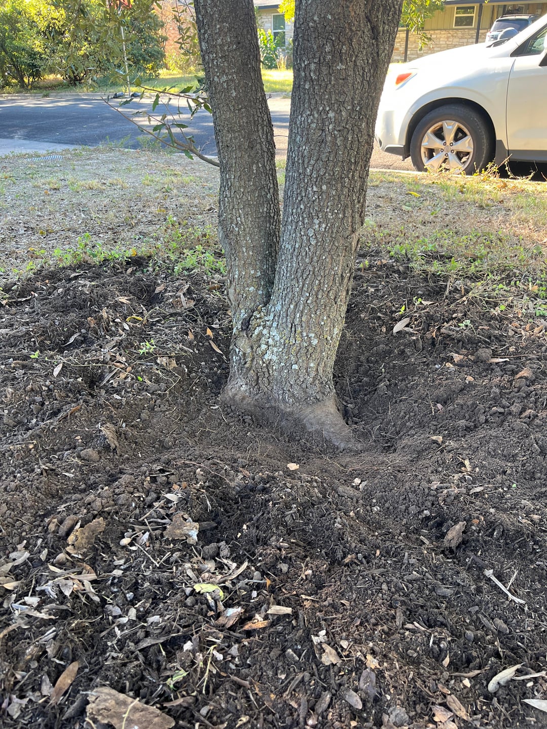 I moved into my house about a year ago and have just now started to work on building up native plants in my yard in earnest. I was raking the area around my live oak to get ready to seed some inland sea oats and turks cap and realized the root flare wasn’t exposed at all. I gently dug down to expose it. Does this look like the right level of exposure now? It was buried up to where the more textured bark starts. should I try to flatten/lower the area around it a bit too? It had a mulch circle that could be brought out further to the drip line of the tree, and I could try to level/flatten the area closer to the trunk with the root flare. Curious what others think about that plan.