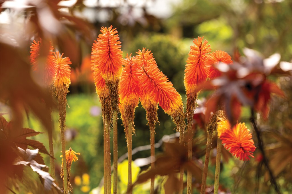 Fluorescent orange spires of red-hot pokers reach for the sky, yellow daffodils glow in the spotlight of the winter sun, and lipstick-red bougainvillea petals flow from a verandah.
