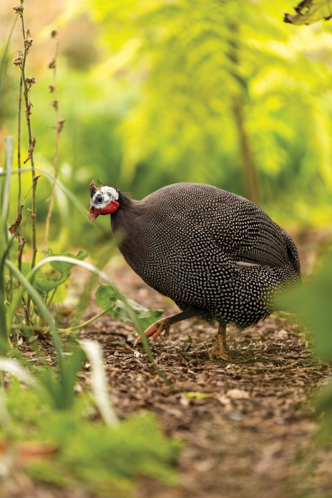 A large flock of guinea fowl roam the gardens. Photograph by Ben Kelly.