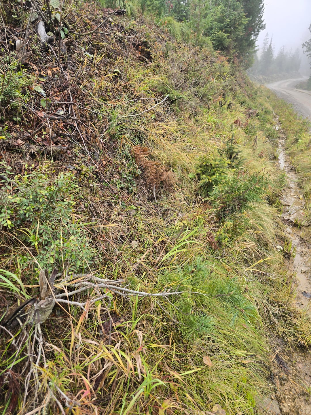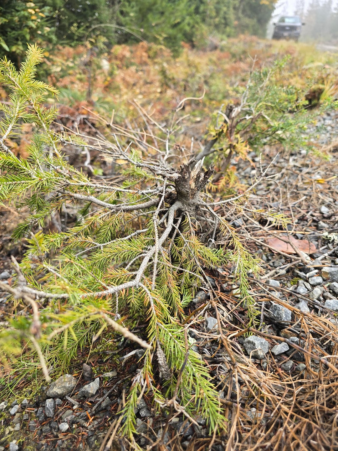 There were five conifer species in this stunted mowed area: hemlock, spruce, redcedar, white pine, and lodgepole. I dug a few with thicker trunks that have been mowed for multiple years but survived. We'll see if they survive being pruned and potted.