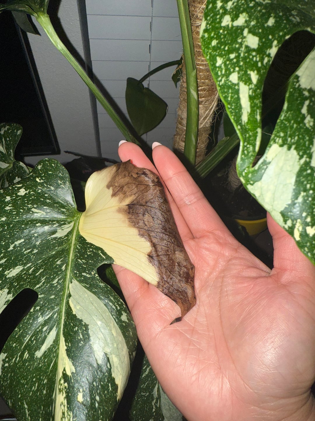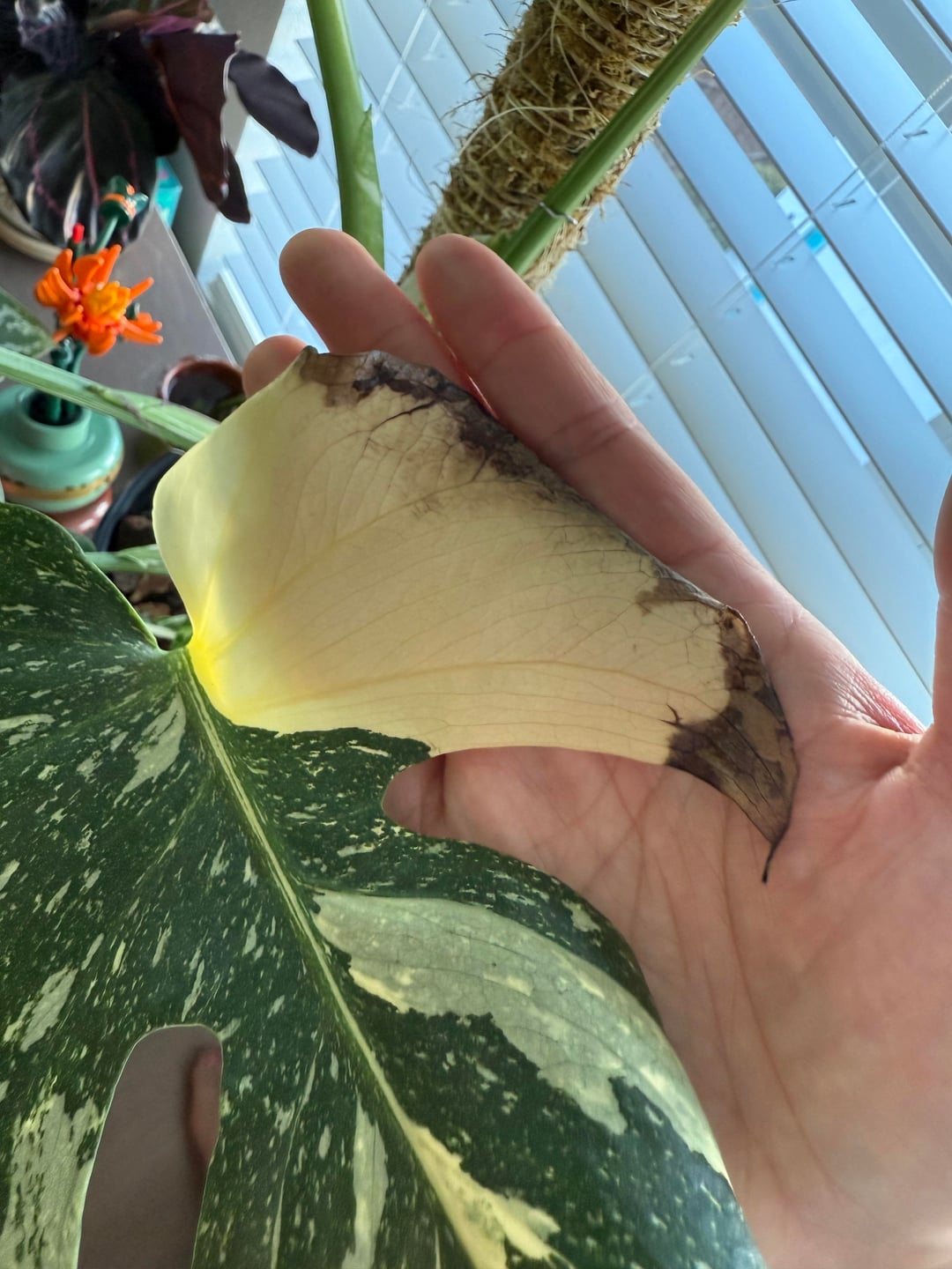 Variegated plants have increased light requirements due to having less chlorophyll. If these needs are not met, the plant will senesce the white portions to reallocate the nutrients and photosynthates in that tissue. How much direct sun does this receive? It needs a lot to accommodate the white portions. If only the white portions brown, it’s definitely from insufficient light exposure. 💚