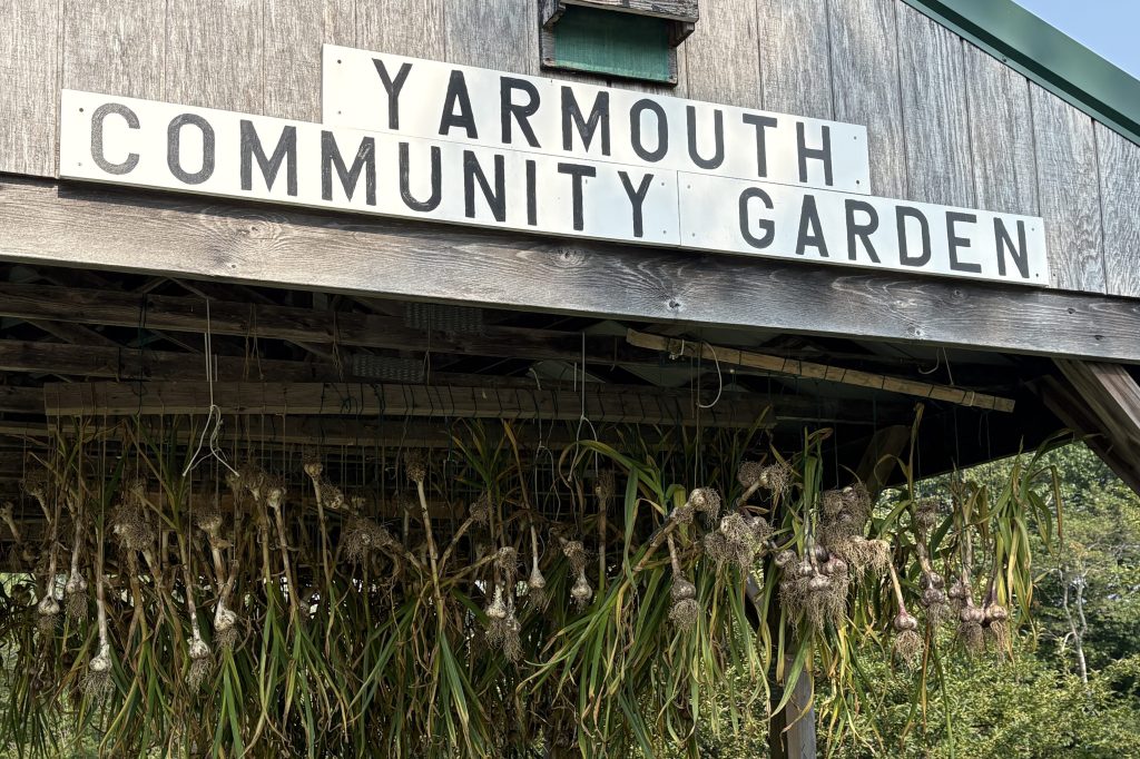 Garlic drying in the gazebo of Yarmouth Community Garden last week. The community food program donated a record 4,456 pounds of produce to feed residents of the town this season. (Courtesy of Yarmouth Community Garden)