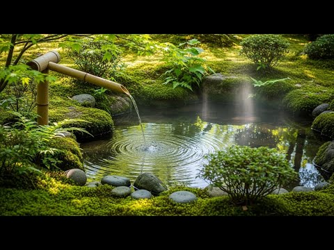 “šæš§ The calming sound of water flowing from bamboo into a peaceful pond, surrounded by green moss and fresh nature.