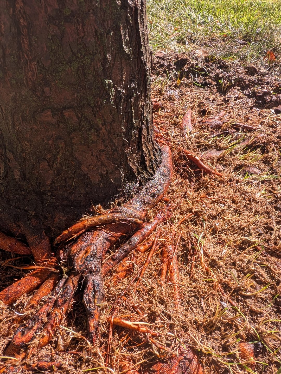 I am excavating grass that was all the way to the trunk of this otherwise healthy maple. I see a flare of the trunk and already removed one circling root (about 1in thick with cut seen pics 1-2 with indented but intact bark underneath; it broke closer to the trunk than I would have liked but I cut a cleaner chunk out between it and the larger source root). Pics 3-4 and the taper show why I believe I'm deep enough. Open to any feedback but my primary question is the large seemingly embedded root in pics 5-8. It looks to have dug into the flare? Picture 8 seems to show to origin of the large root wrapping around the left but true exit point is under other roots. Picture 5 shows it forking and moving away from the tree. It doesn't look to be circling anymore as it turns away from the tree so I assume messing with it would do more harm than good at this point? Do I need to debulk any of the smaller roots over lying?