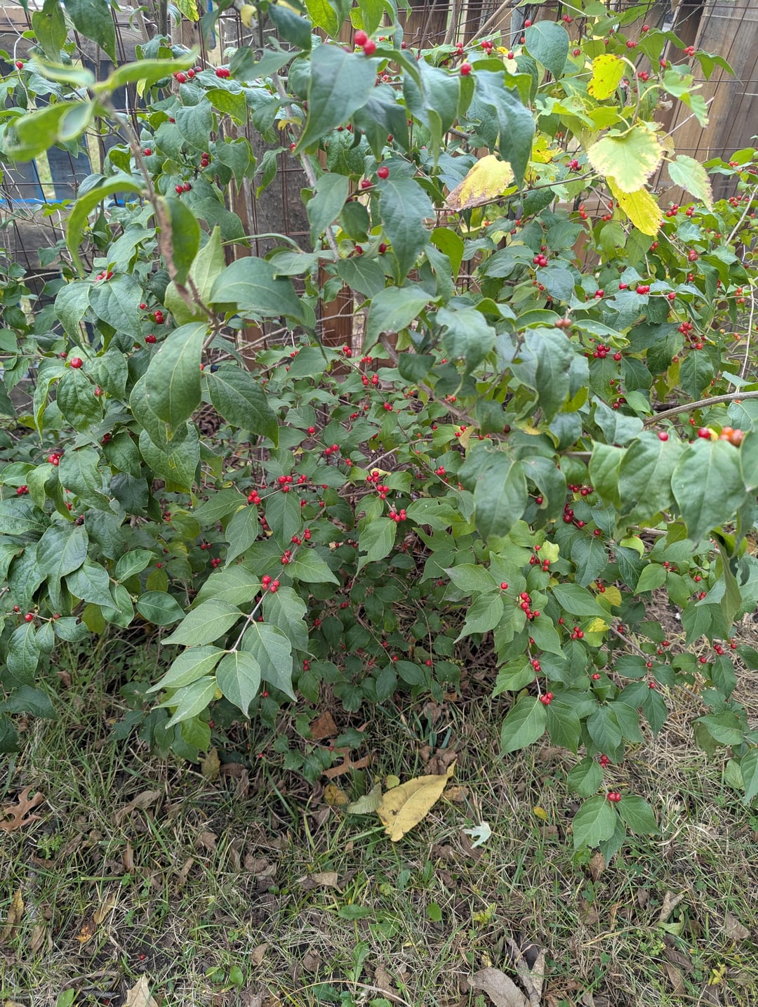*Lonicera maackii* (Amur honeysuckle). It’s invasive in the US, especially the eastern half, so it should be removed. The fruits are mildly toxic, from what I’ve read.