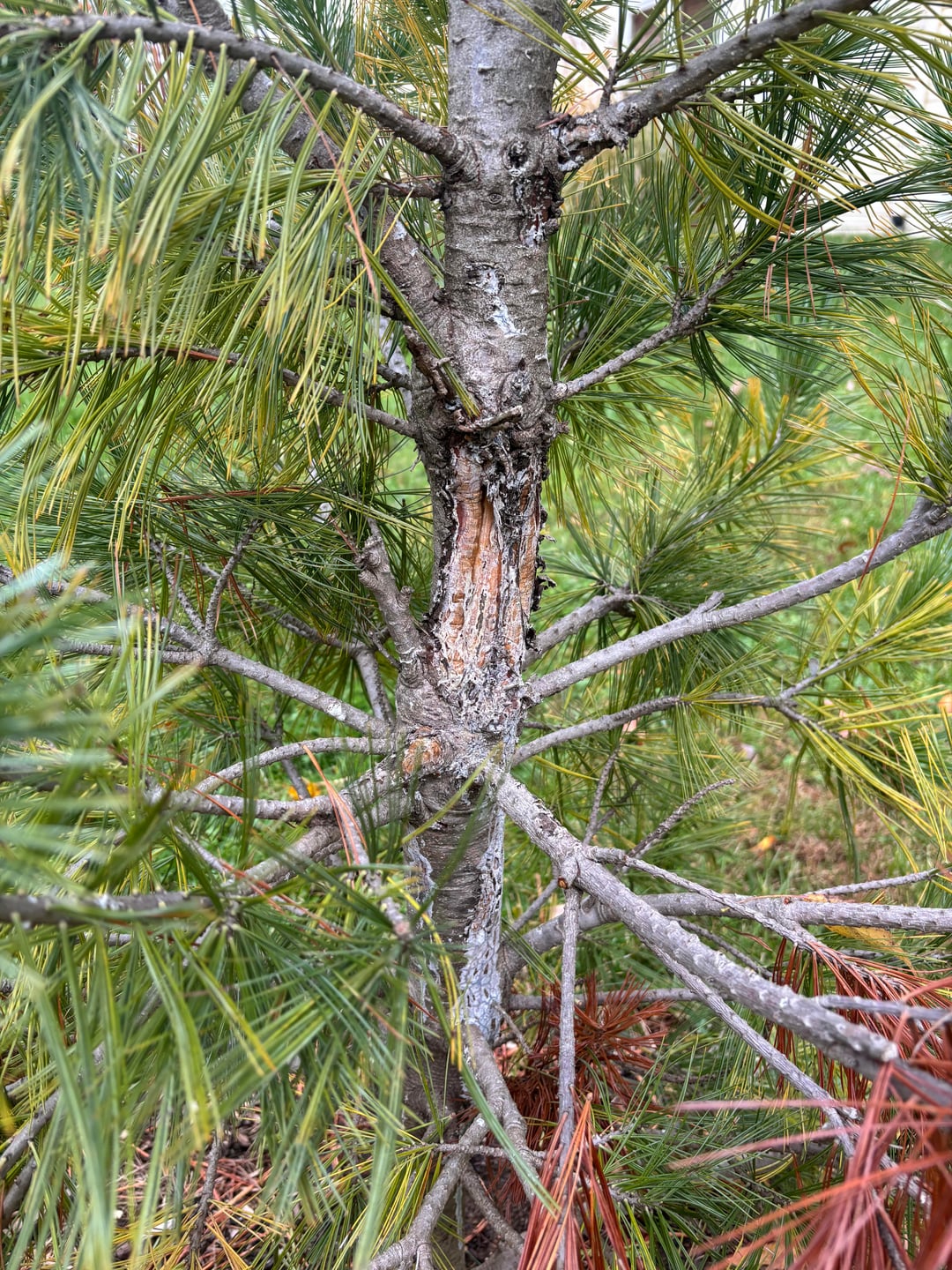 We noticed an injury on the trunk this summer that we thought was from a deer and hoped it would heal itself. I took off one branch that was dead but now another is dying. Is it hopeless or is there anything I can do?