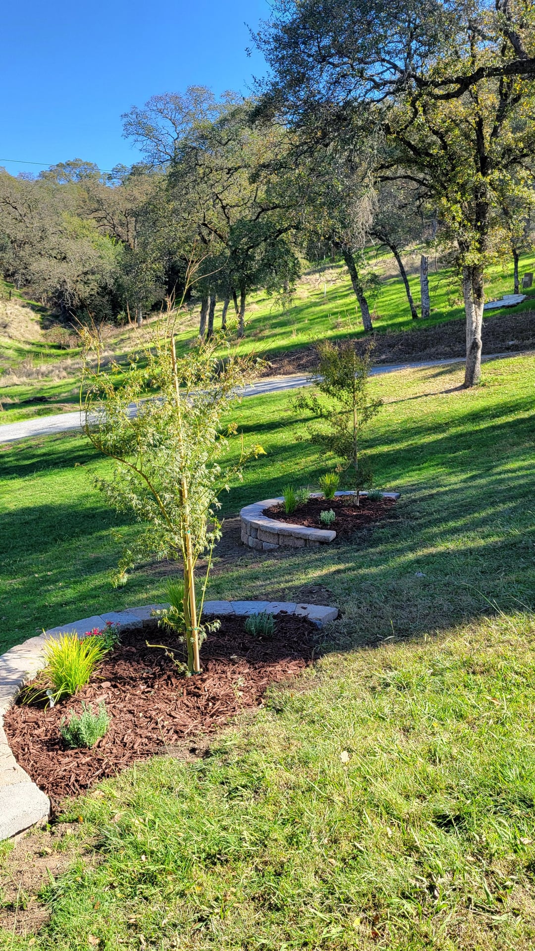 They prefer full sun but it is possible for them to get leaf scorch. I’d recommend a drip line or soaker hose set up bc they will need a lot of water. I’d also remove the mulch at the base of the trees, while mulch is good for retaining moisture, if it’s too close to the base it could cause problems. If you were to do any adjustments I’d do it before the roots start settling otherwise it will put the tree under stress.