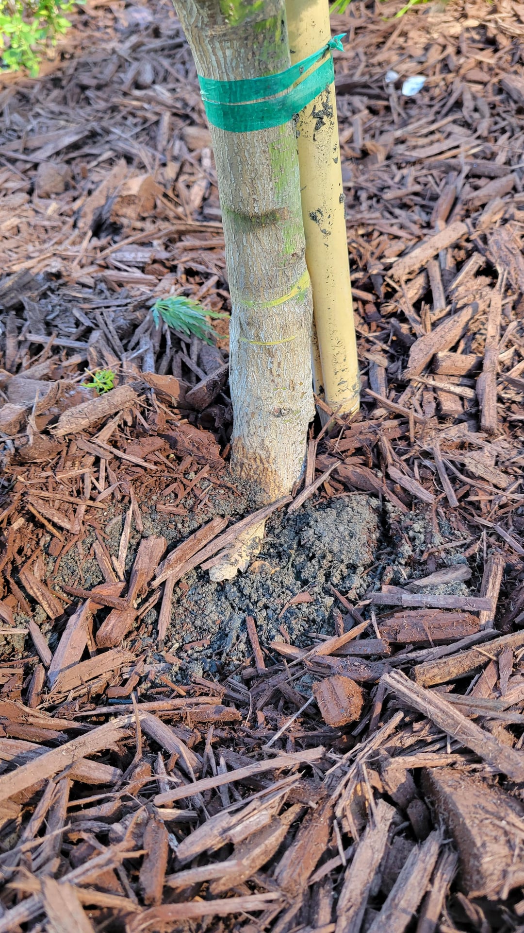 A competent tree pro wouldn’t leave the nursery shipping stake on the tree at planting time
