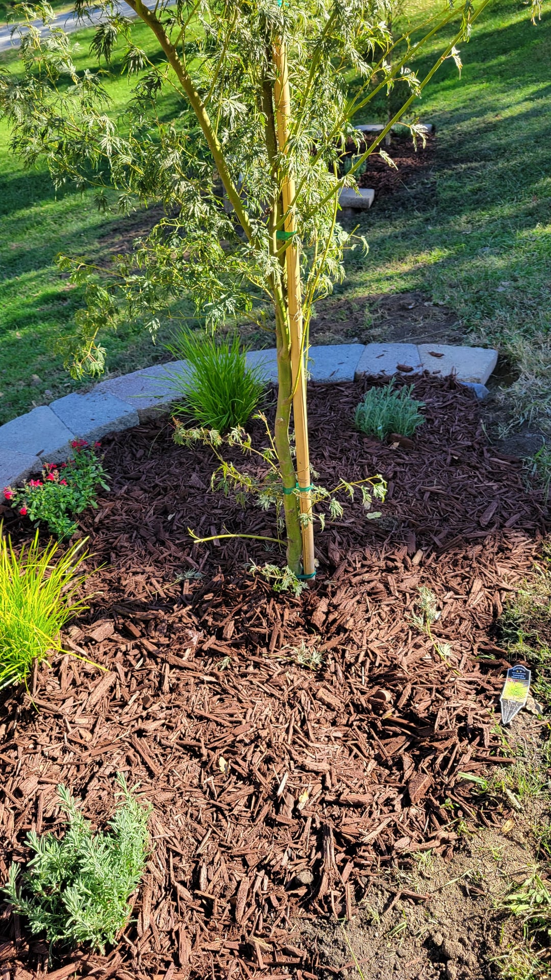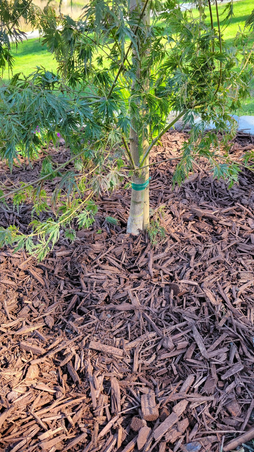 My folks hired a contractor to redo the front garden bed (not pictured) and add some trees to the front, but I noticed that they seemed planted a bit deep? First one is under like 4" of mulch, the other one maybe 2-3".