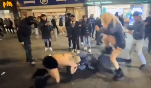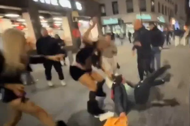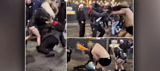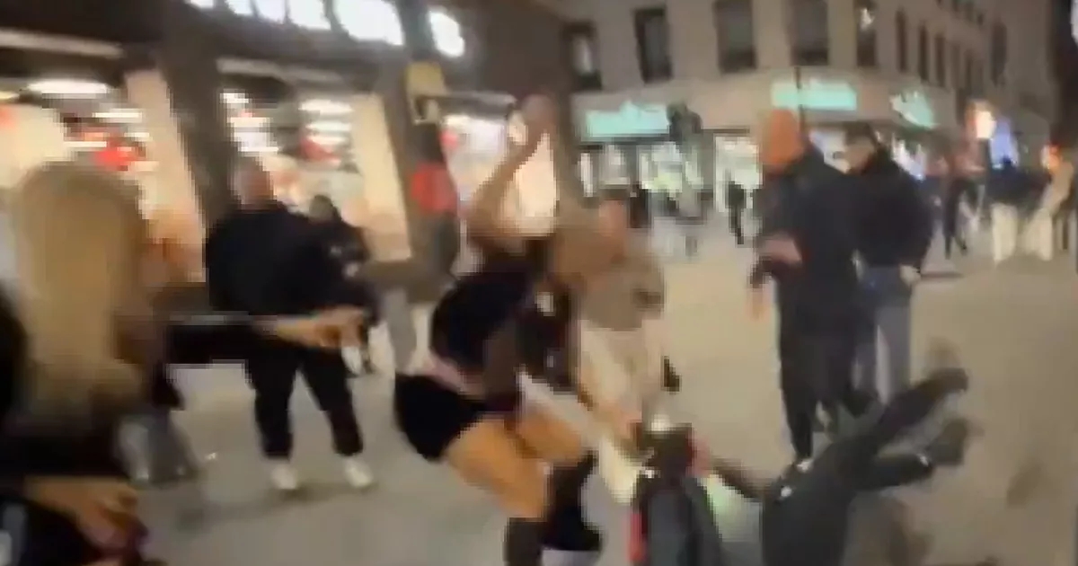 The footage shows violence erupting in Piccadilly Gardens. People can be seen kicking and punching each other amid a crowd of onlookers, many of them recording on their phones.