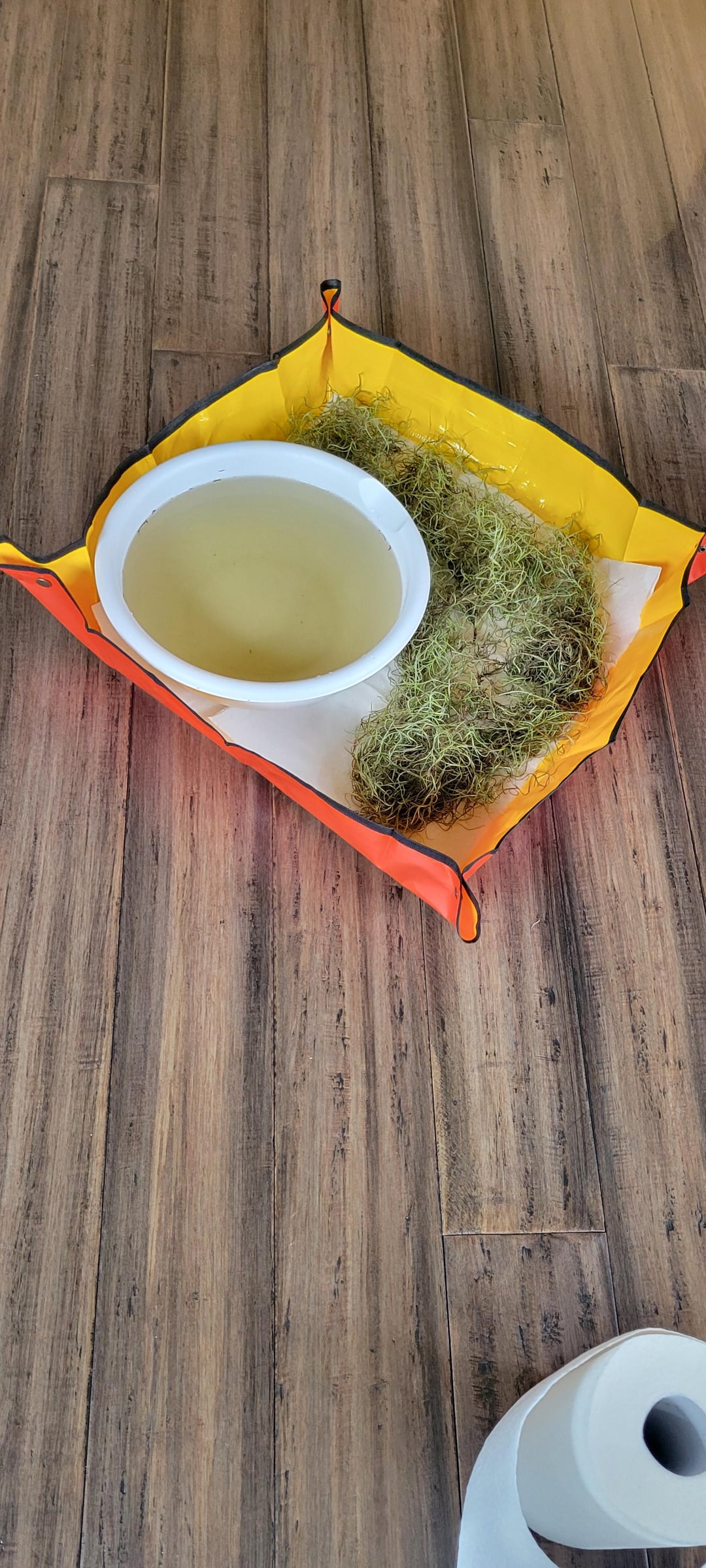 It arrived plenty moist so I waited a week before watering. Last weekend was my first time watering…it took the whole weekend! I soaked it in bowls of dechlorinated water with a bit of hydroponic fertilizer for about an hour (same as I do my other air plants). This took multiple hours because I only have 3 bowls big enough to hold a clump. Then I laid it out to dry on paper towels… again, hours to dry! I finally got a clothes rack and started hanging it in front of a fan to speed things up. Once dry, I re-displayed.