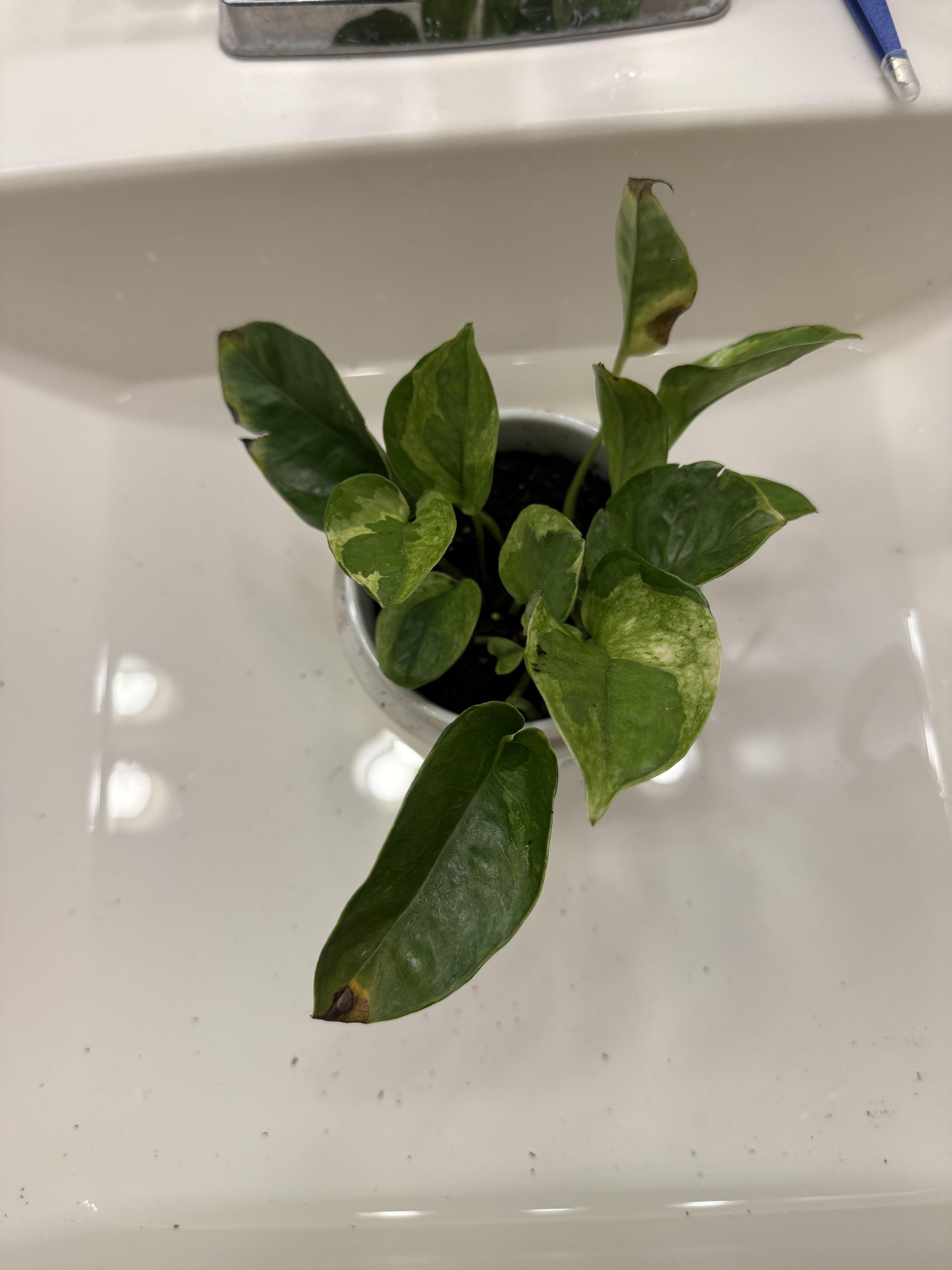 This is my Lowe’s clearance lemon top pothos. I bought it a few weeks ago and let it hang out in the pot it came in because the soil was super wet and I didn’t want to do too much to it. I repotted it the other night as the soil had like little bugs in it (ew) I did my best not to disturb the root system and then watered it after I potted it to get the soil settled.