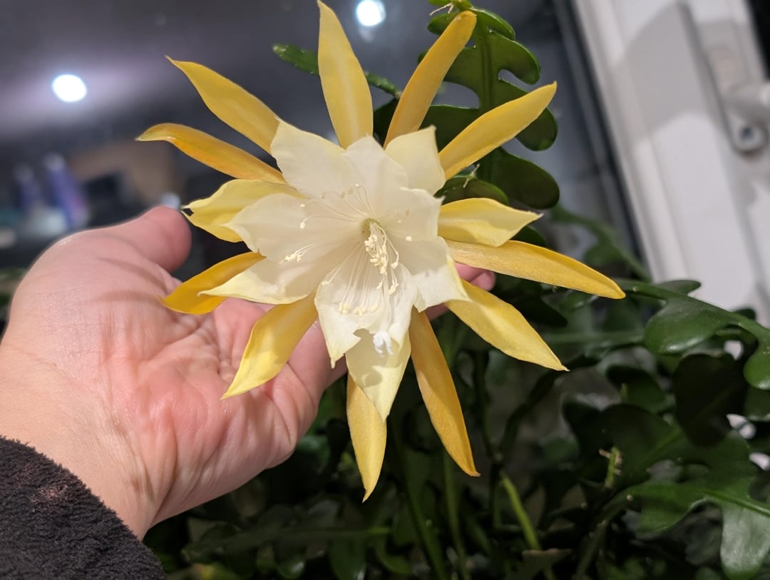 Disocactus anguliger commonly known as the fishbone cactus or zig zag cactus. I was wondering where the lovely smell was coming from, and then yeah, finally it bloomed 🖤🖤🖤 by maelstromheathen Fat Plantssucculent plantssucculents 8 Comments AsleepNotice6139 5 days ago Just gorgeous! 🤩 Congratulations! SmoothD3vil 5 days ago Stunning!! Congratulations! 🪴👌🏻 anthurium_laila 5 days ago Magnificent!! 😍😍 gmamacheryl 5 days ago Fabulous!!! dusti_dearian 5 days ago Wow that’s beautiful. I haven’t seen one that big before. Thank you for posting. It’s something for mine to aspire to. 🙂 BreRawl 5 days ago Absolutely Beautiful 🤩 SoozeeQew 5 days ago My zigzag goes nuts and wants to start climbing up the bushes — I have it in a pot to constrict its growth. Do you cut yours back? Brave-Professor8275 5 days ago What a stunning specimen. Congratulations, the flower is big and beautiful!
