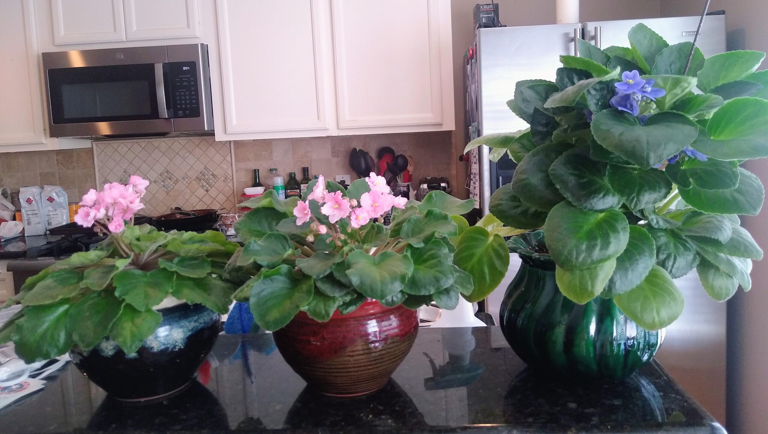 My African Violet family. The pink one in the middle is the original that I almost lost. The one on the left was propagated from one of the leaves. The violet African Violet is so dense you can barely see the blooms. I have tried to "fix" it by cutting it back. It grew back the same way. They all sit in front of a east facing window.