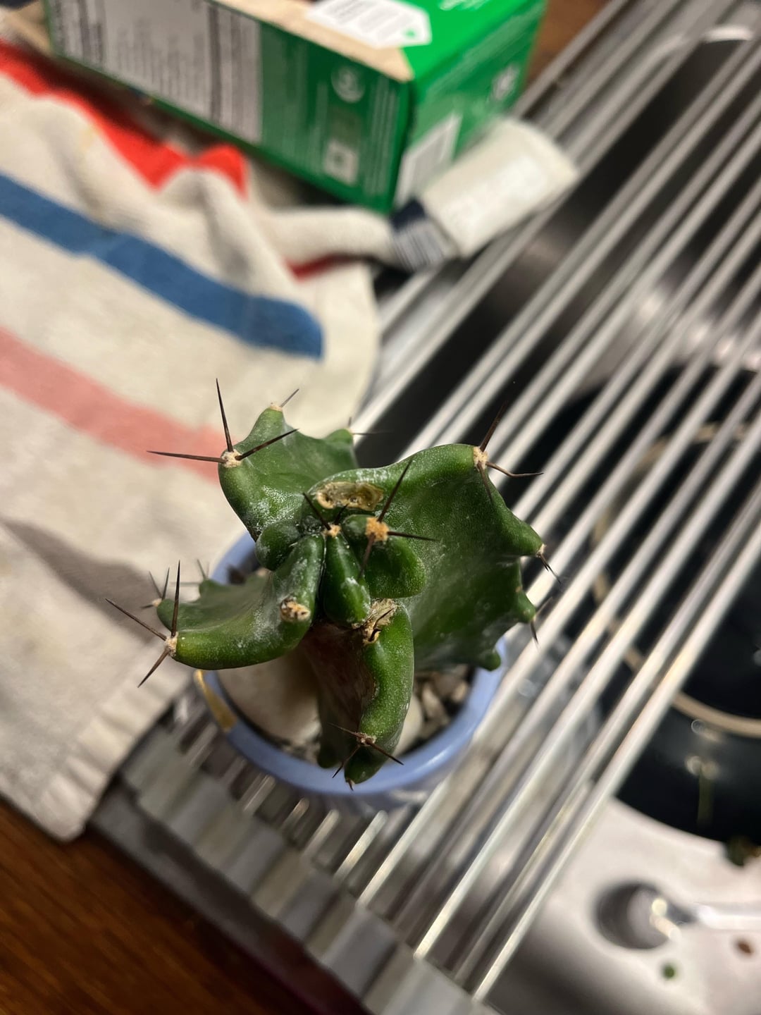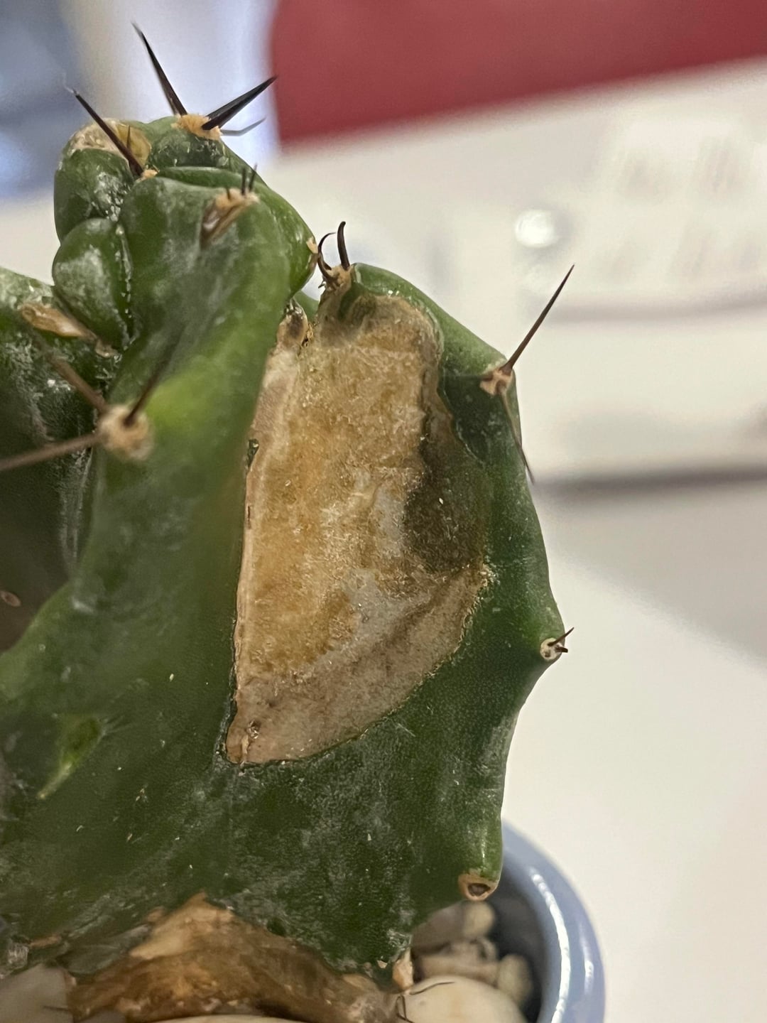 Rescued this lil guy from the trash. He’s been in gritty soil for about 6 weeks. I removed some scale when I found him and isolated in a sunny window. Haven’t watered at all. I have other cacti and know the glazed pot isn’t ideal but it’s got a drainage hole and lots of grit.