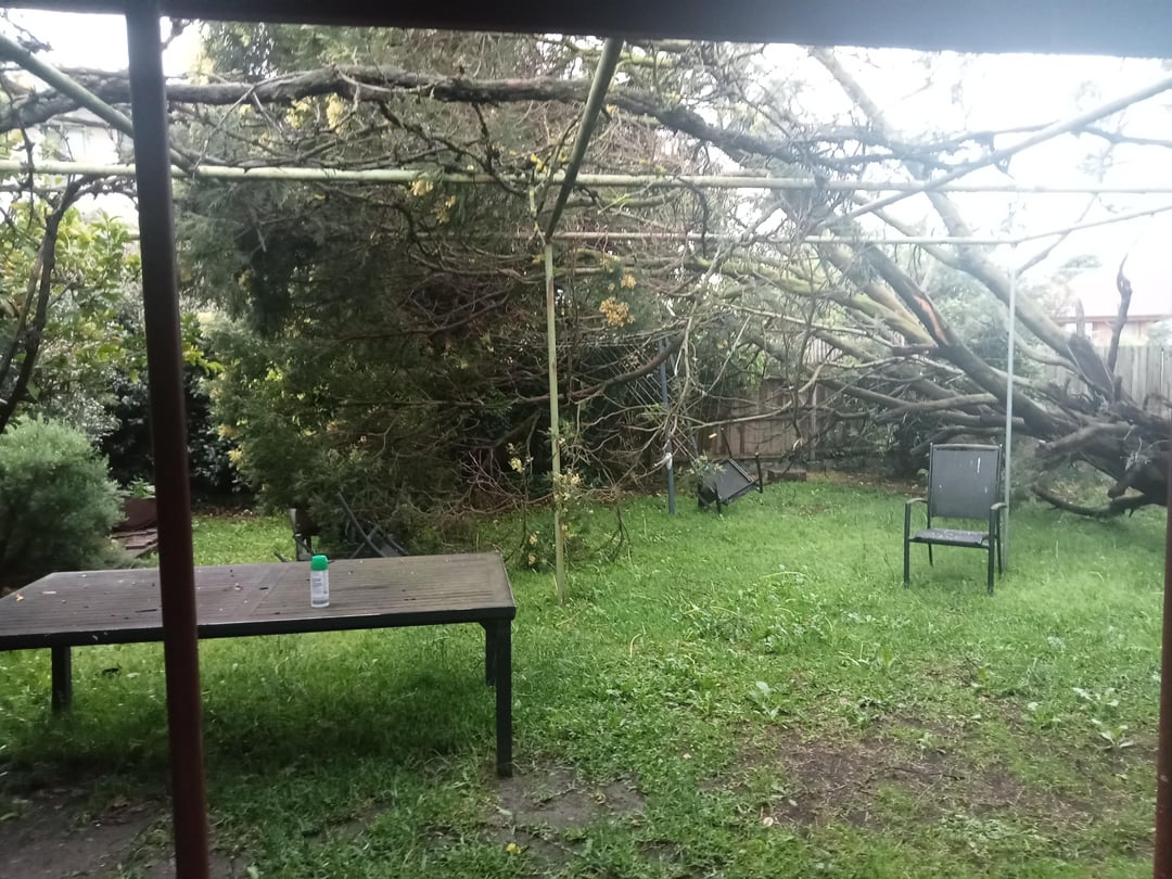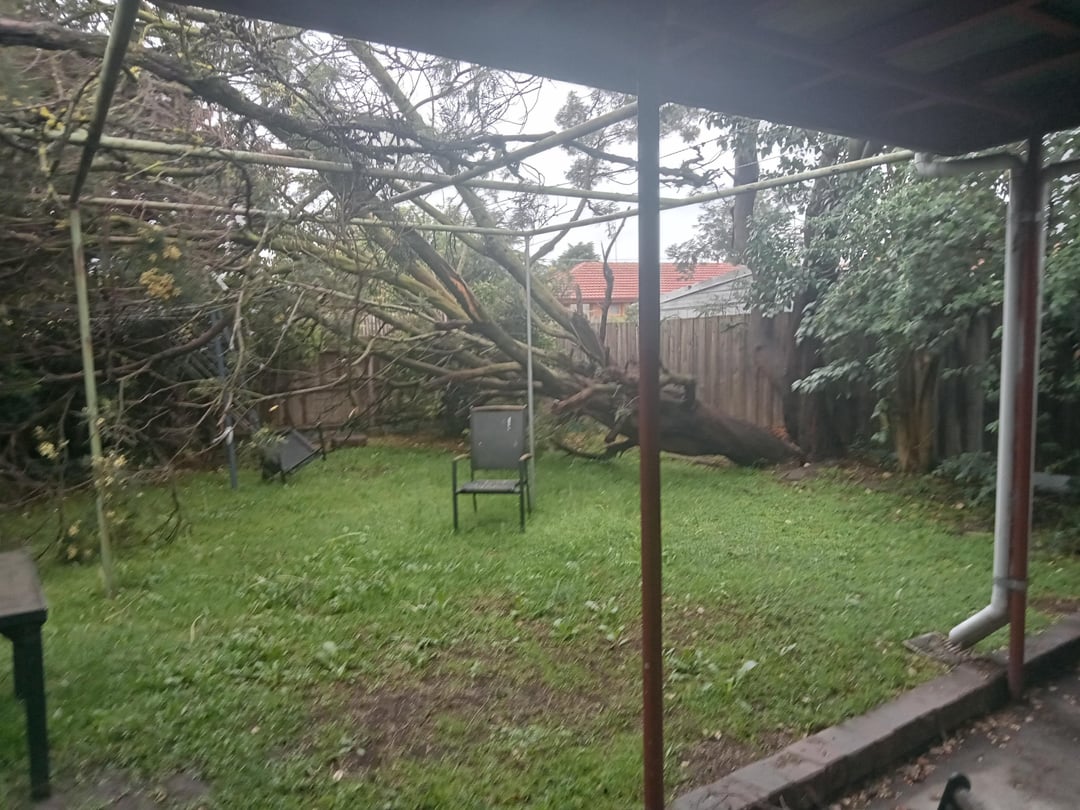 Is there any way I can save this felled tree in my backyard? It was blown over by last night's heavy winds and it's still connected by the base. I really want to repair this tree if it's at all possible because we get a lot of brushtail possums and this tree is their absolute favourite; they like to jump from the poles to the branches like a giant jungle gym. I'm worried that losing this tree will make the brushies come over less frequently and potentially be more vulnerable to the local strays.