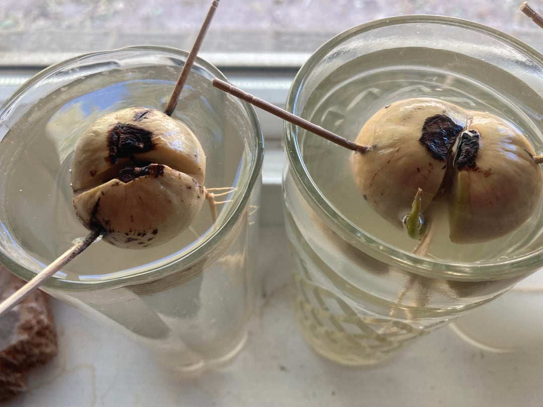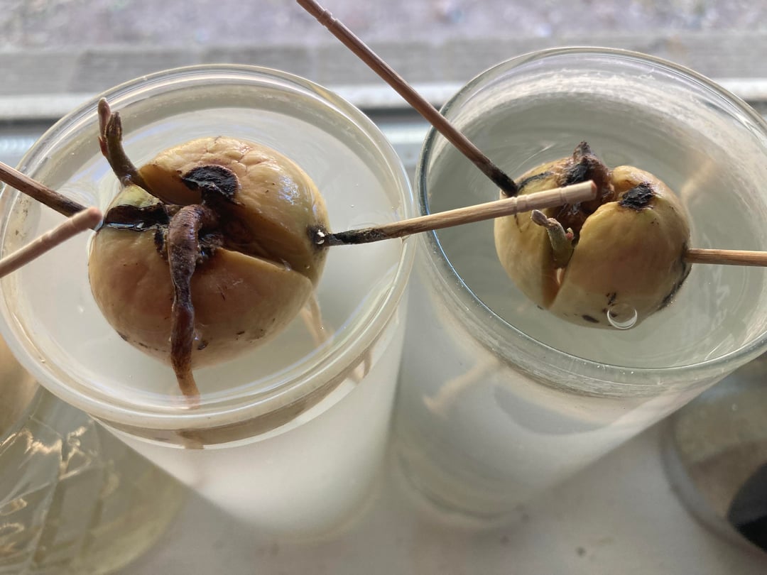 Il faut changer l’eau, essuyer les noyaux et les réhausser de façon à ce que les noyaux ne soient pas en contact avec l’eau mais seulement le début des racines. Il faudra les mettre en terre quand la tige fera quelques centimètres.