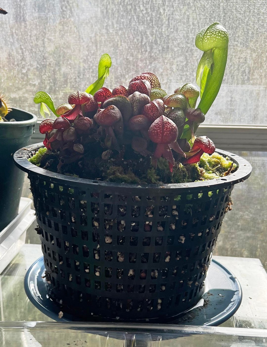 This is my ‘backup’ that was growing in a basement terrarium. Just repotted into this larger net pot. It seemed stunted for the longest time until because it was catching no prey I got the idea to start injecting it through the top with a weak fertilizer or sometimes Maxsea solution which is finally starting to pay off.