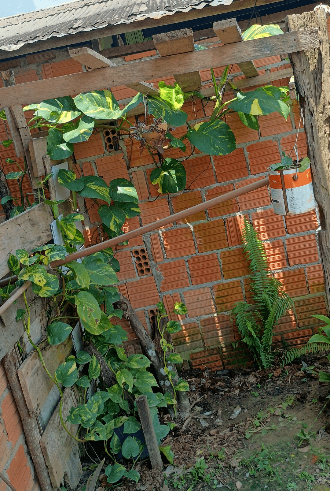 It is doing so well 🥰 who could tell… This plant was small and dying in a friend's house and she gave it to me. Now, two and a half years later, it is beautiful and going! I'm trying to make it grow horizontally now above those planks but it keeps going upwards, it will burn in the sun over the roof… Maybe I let one branch go there so it learns and stops lol