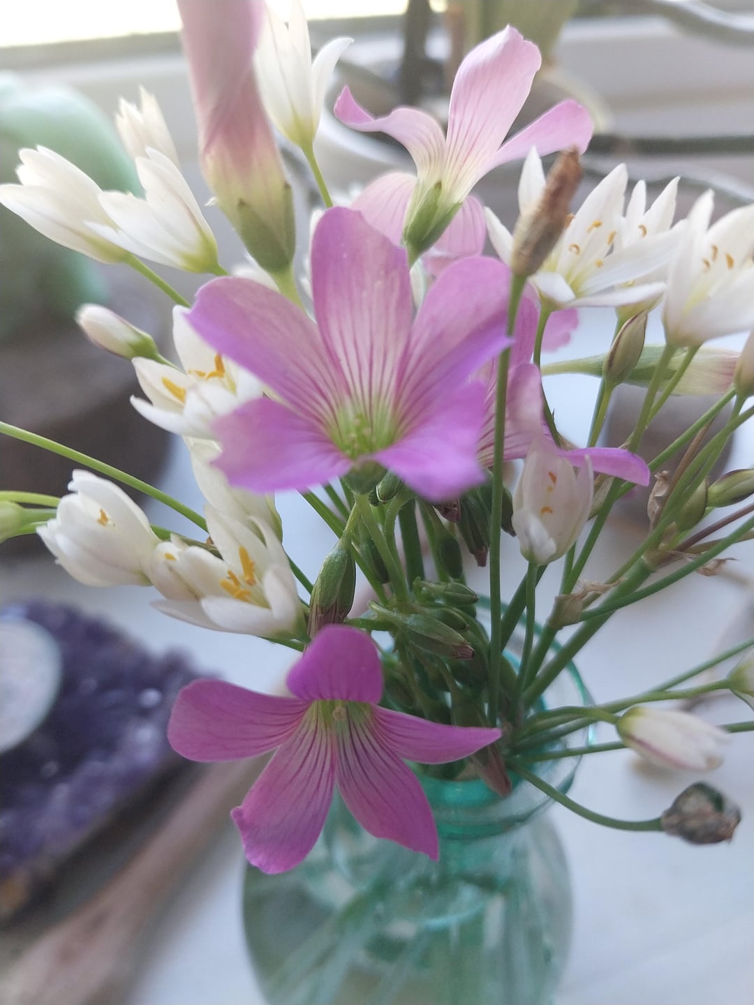 *Nothoscordum* sp. (the white ones) and *Oxalis* sp. (the pink ones).