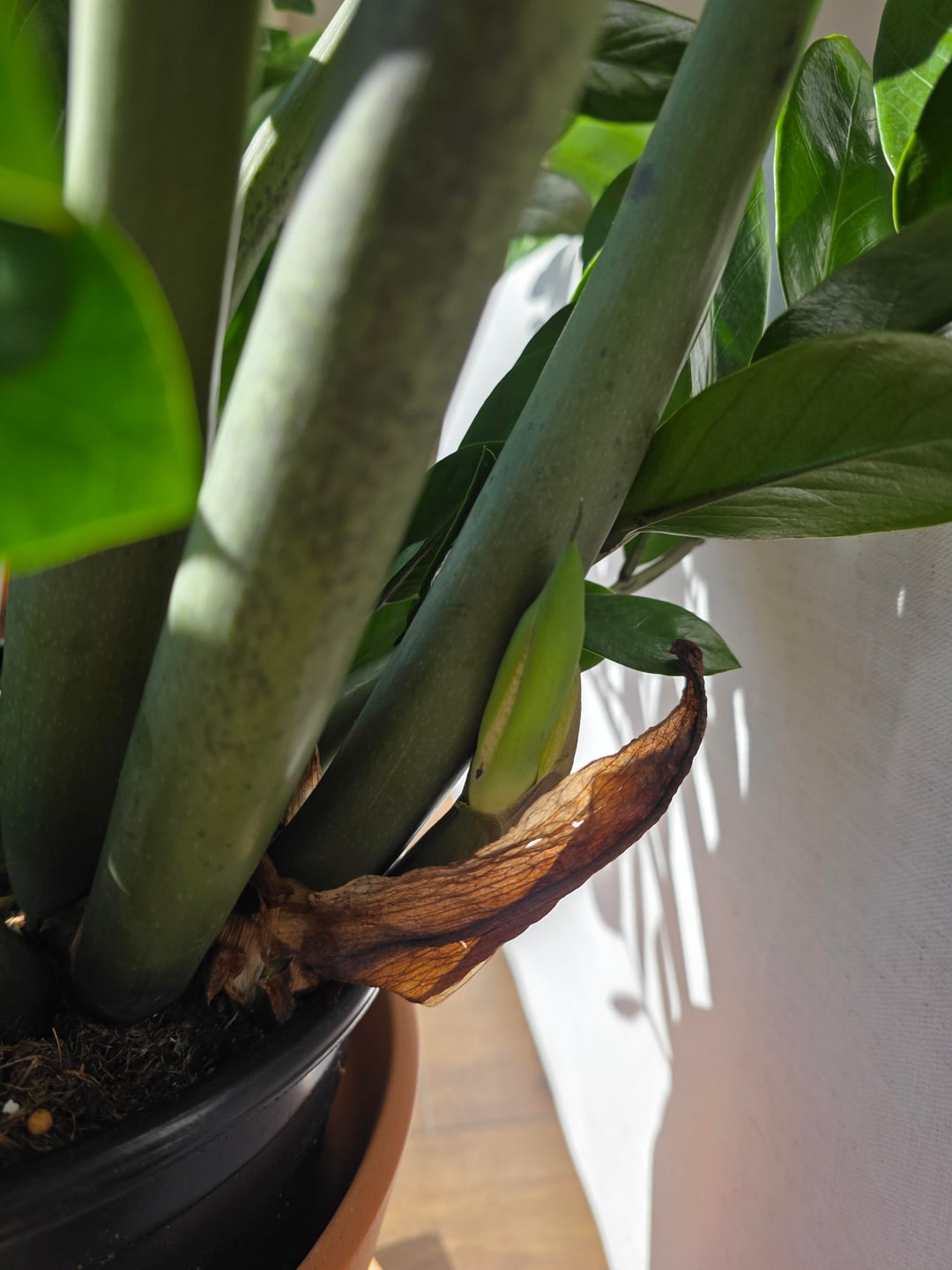 Our zz plant is flowering. Its got two flowers that we initially thought were new growth.