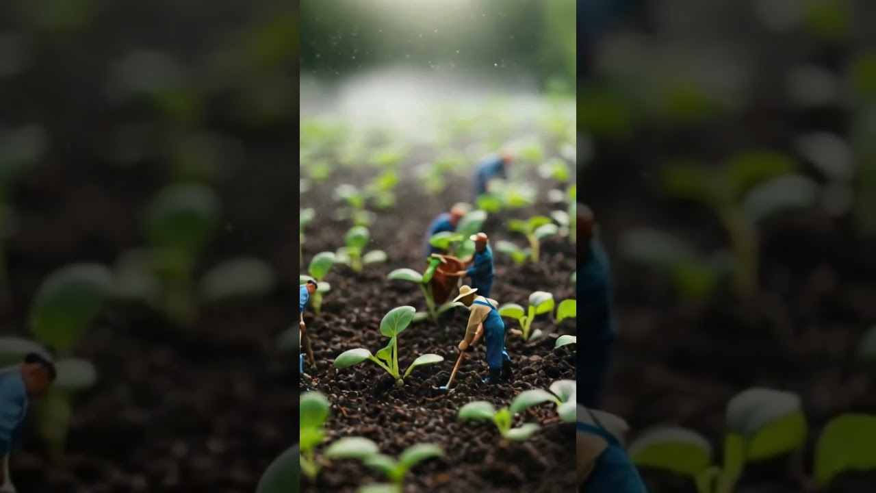 Watch as each micro-sized farmer works with astonishing precision—planting with tiny shovels, biodegradable pots, and miniature forks. A fine mist from a microscopic irrigation system bathes the field, creating a magical glow over the landscape.