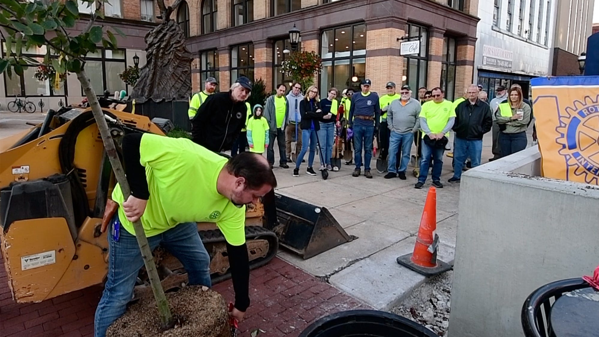 Rotary representative Aaron Jacobs teaches 50 volunteers how to plant 63 new Serviceberry and Ginkgo trees in downtown York.