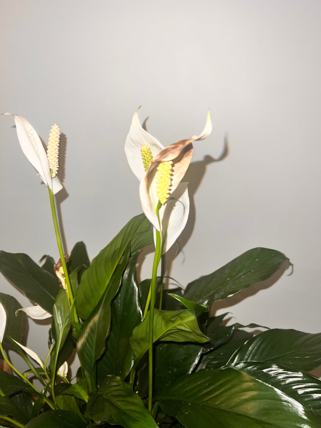 Peace lilies likes to get lots of water when watered. I water mine in the sink, I thoroughly soak the soil, let them sit for a few minutes and the put them back in the decorative pot.
