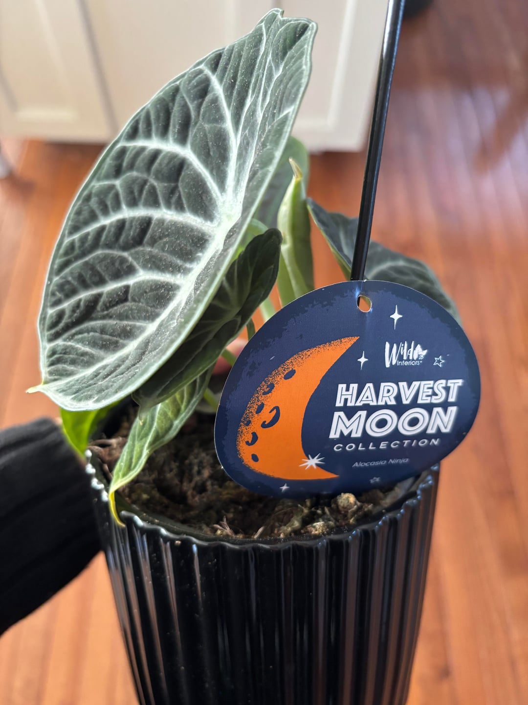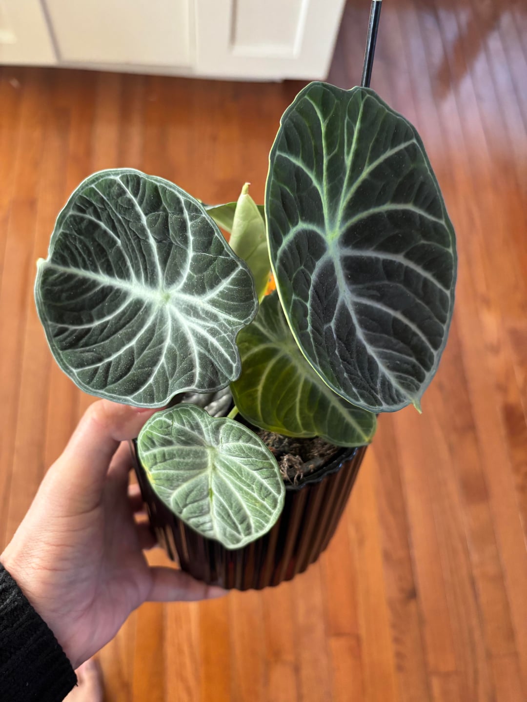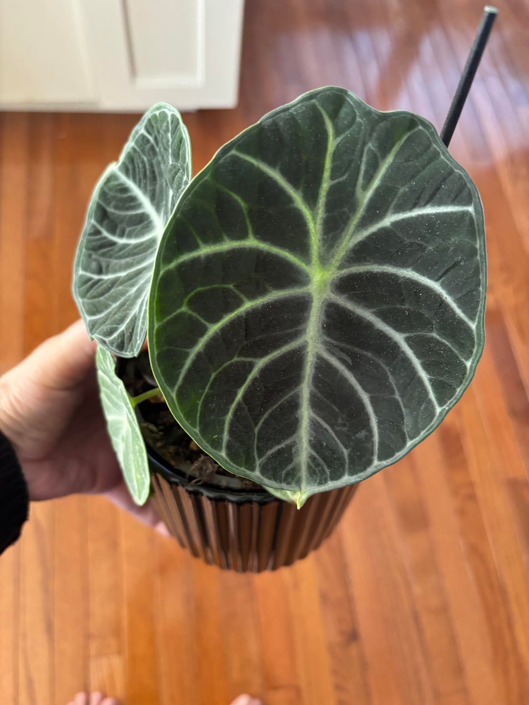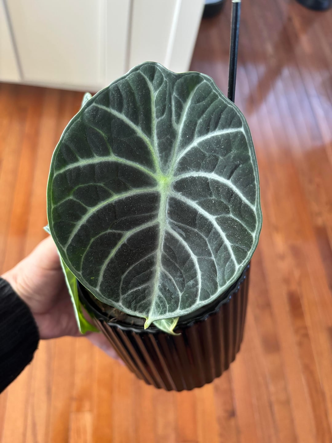 This is Alocasia reginula ‘Ninja’—care is similar to other jewel Alocasias. It differs from the other common A. reginula cultivar, ‘Black Velvet’, by having typically rounder leaves and a distinctive doubling to the veins along the outer rim of the leaf.