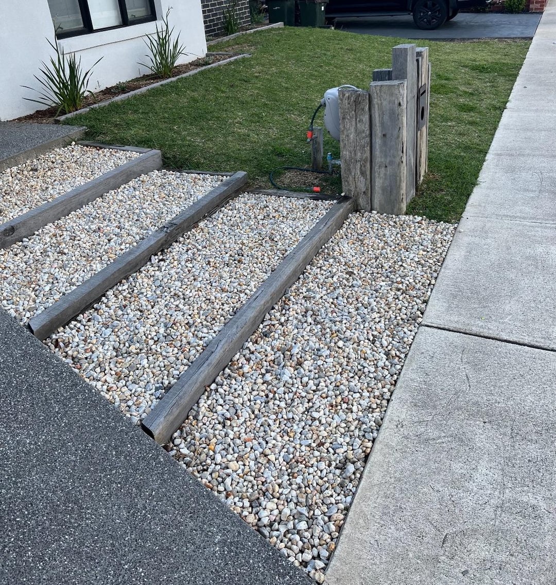 I like the idea of something that “flows” or trails a bit at the front, whether it’s a westaringa or a low flowing grevillea would also look really pretty. Then behind them, I’d aim to zig zag plant some small- medium shrubs with something as a feature in the middle.