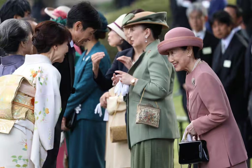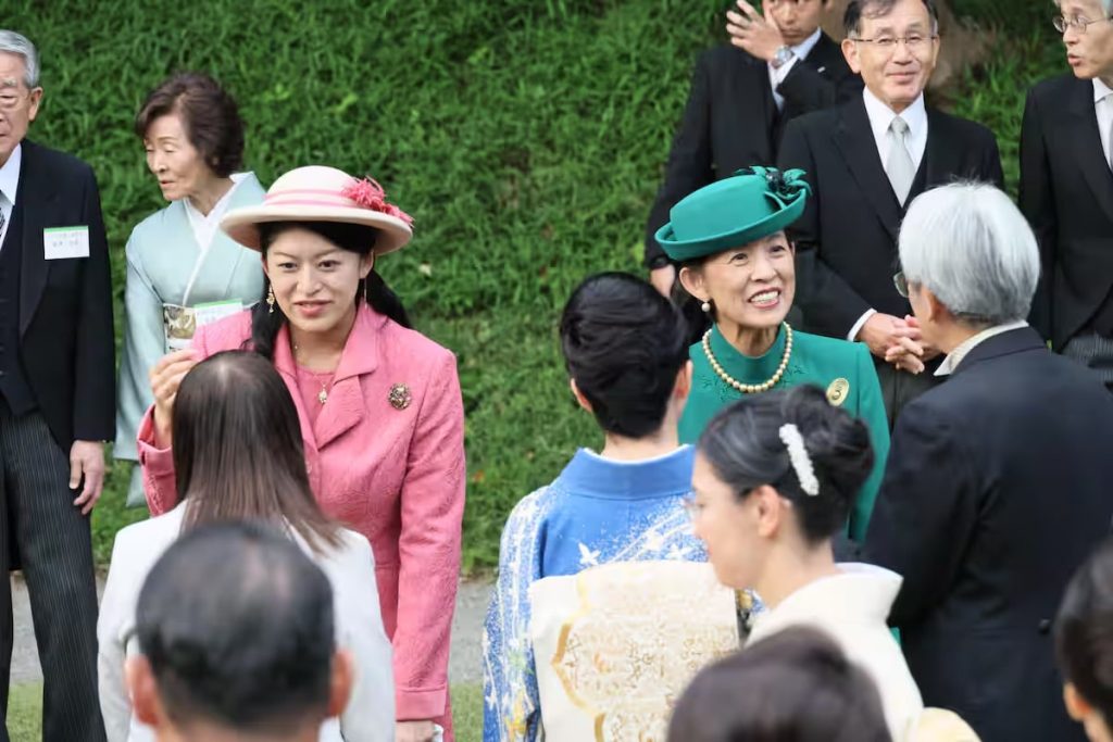 Princess Takamado and her daughter, Princess Tsuguko, converse with guests at the Garden Party at the Akasaka Imperial Gardens in Tokyo on October 28.