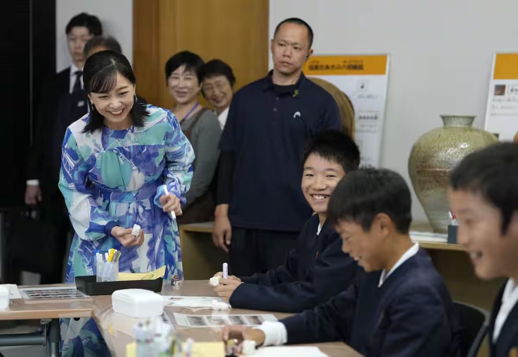 Princess Kako interacts with elementary school students participating in Shigaraki ware painting at the Shigaraki Ceramic Cultural Park in Koka City, Shiga Prefecture, on October 26.