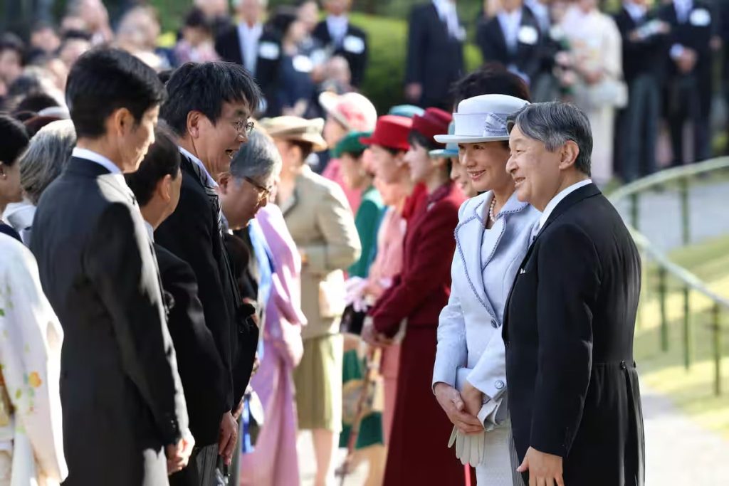 Their Majesties the Emperor and Empress speak with guests at the Akasaka Imperial Gardens in Tokyo on October 28.