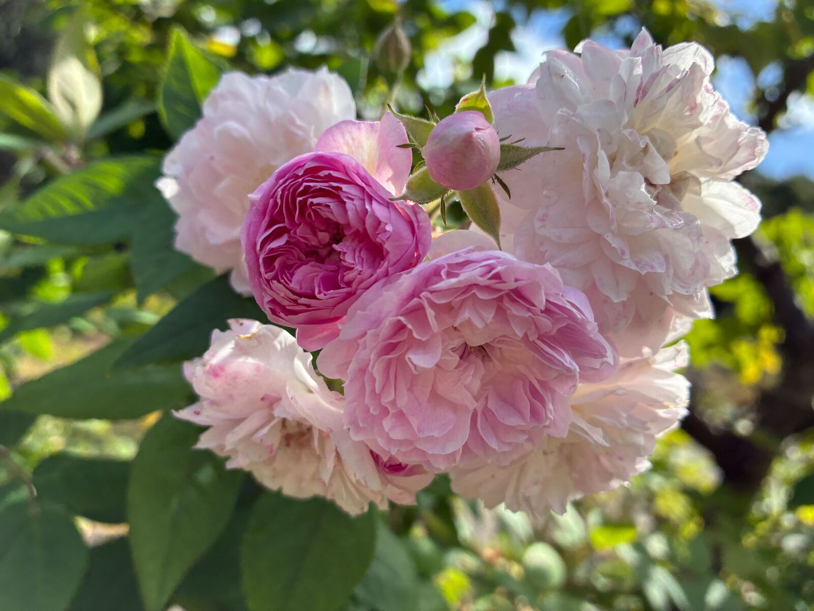 A blooming Blush Noisette” rose, bred in 1814 and one of the Morcom garden’s many heirloom flowers. Credit: Darwin BondGraham